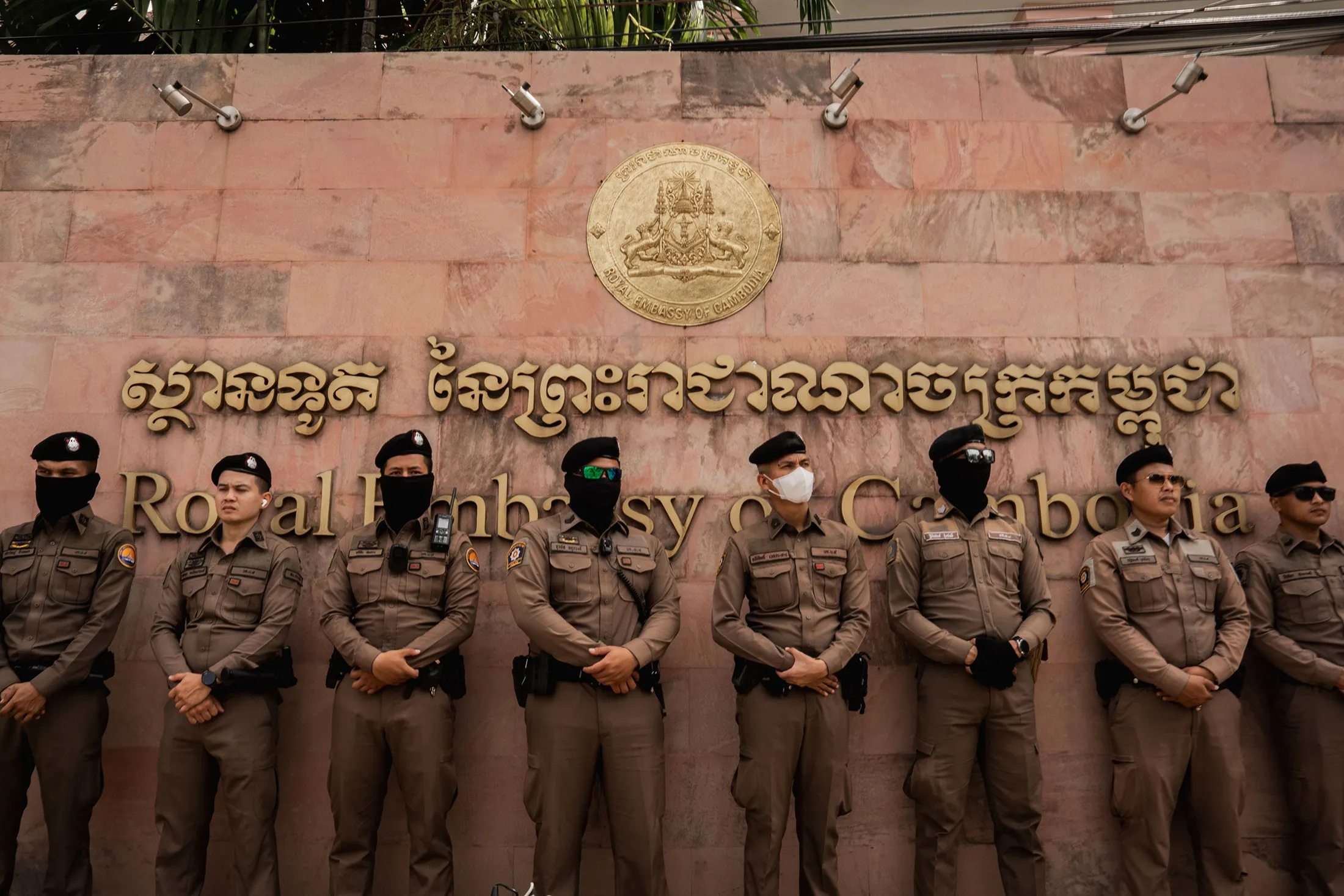 7月20日,泰國警察在曼谷柬埔寨皇家大使館外警戒,當時正值泰柬邊境緊張局勢引發示威活動。
