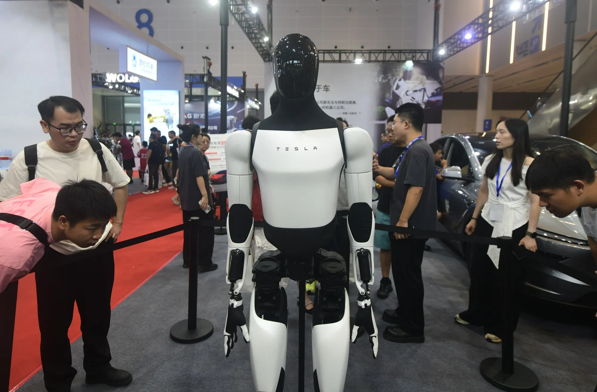 特斯拉Optimus機器人亮相中國杭州。攝影師:NurPhoto 快問快答(禁止作弊!)。 哪位共產主義時代的獨裁者形象正在被重塑,將其描繪成勝利領袖而非數百萬公民死亡的負責人? 答案請發送至**[email protected]
