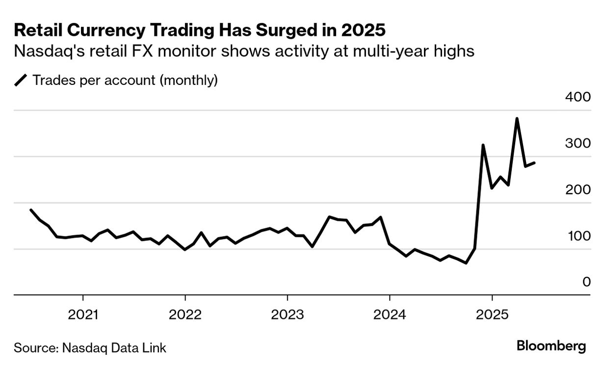 根據彙總多家交易平台數據的Finance Magnates Intelligence統計,2025年前六個月,他們每天在外匯市場投入約6000億美元。Finance Magnates表示,這一數字較上年增長28%,與eToro、盈透證券、Tradu和FxPro報告的交易量激增情況一致。若排除市場已基本穩定的日本,增幅則達51%——較五年前更是飆升174%。