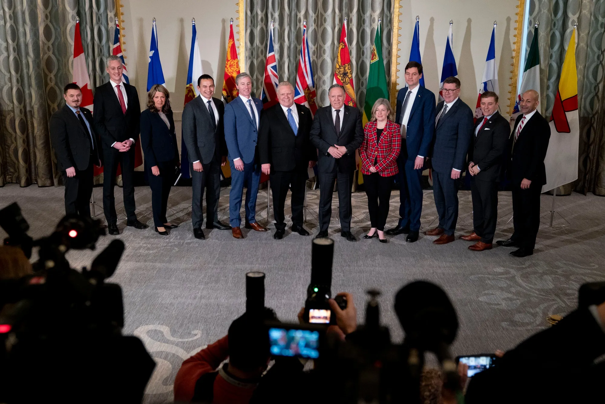 加拿大各省省長(攝於二月華盛頓特區):展現出前所未有的團結。攝影師:Stefani Reynolds/彭博社在為期三天的峯會期間,我看到一名孤獨的抗議者拿着擴音器在公路上踱步,並聽説有護士們組織有序的抗議活動曾經過場。但在警力森嚴的度假村內,這個國家核心立法者們展現出近乎超現實的團結氛圍。