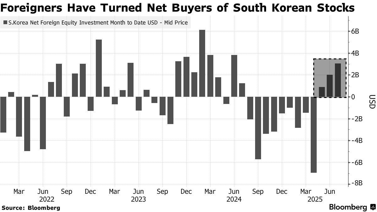海外資金在連續九個月拋售韓股後(截至4月),正大規模迴流該市場。自6月初以來,包括高盛集團、摩根大通、花旗集團和摩根士丹利在內的多家國際投行策略師紛紛上調韓國股市評級。基準指數Kospi在2025年累計飆升33%,推動股市總市值三年來首次突破2萬億美元大關。
