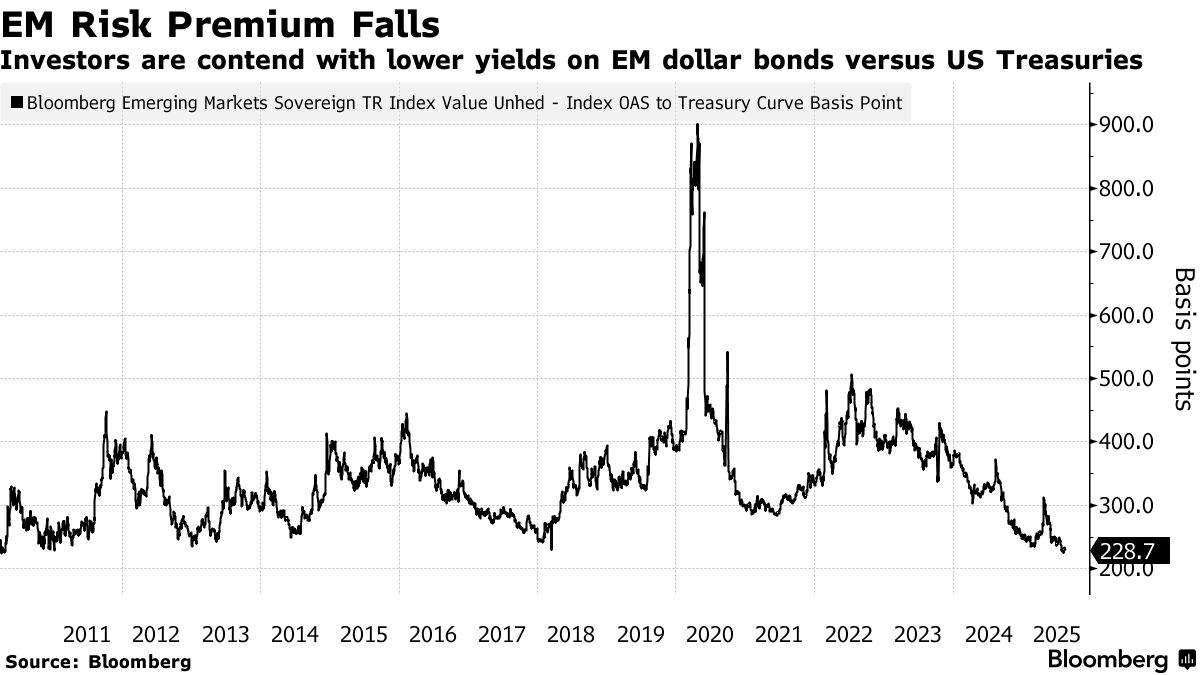 最新全球資金流向數據顯示,該資產類別持續繁榮,投資者持有發展中國家主權債相較美國國債要求的額外收益率剛剛觸及15年低點。這種緊縮的定價環境,疊加美國政策及全球衝突的不確定性,正推動對沖基金在參與歷史性上漲行情的同時控制風險。