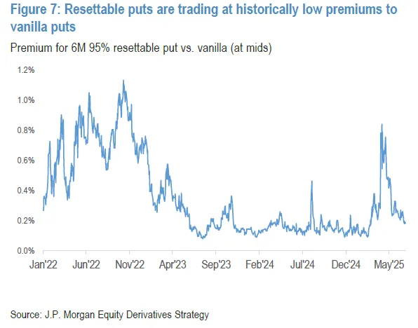因此策略師們正推薦場外衍生品方案。瑞銀集團和摩根大通近期建議採用回望型或可重置看跌期權——其行權價會隨市場上調(回望看跌期權的行權價設定為交易期間最高收盤價)。摩根大通策略師Bram Kaplan在本月報告中指出,這類期權當前較普通看跌期權的溢價處於歷史低位。