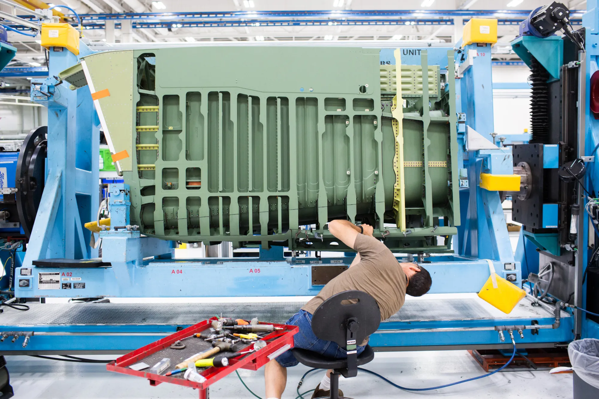 一名員工在密蘇里州聖路易斯的波音防務、太空與安全設施內,為一架波音公司F-15攻擊鷹戰鬥機的後機身進行作業。