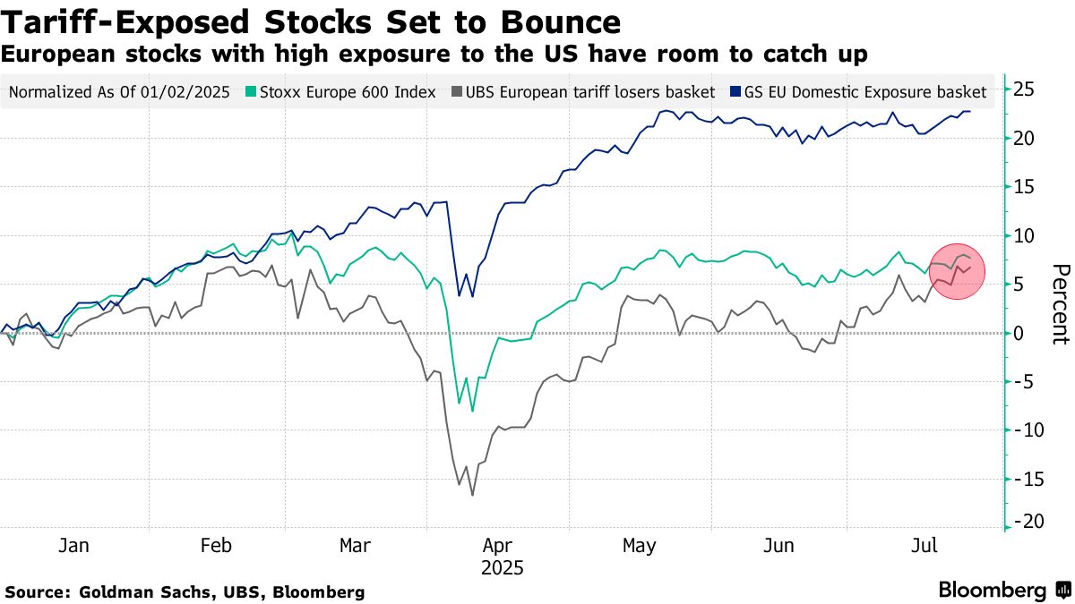 由於對全球貿易前景的擔憂,歐洲股市自5月以來一直處於區間波動。基準斯托克600指數目前較3月創下的歷史高點下跌2.3%。瑞銀編制的關税敏感股票組合今年表現遜於大盤,表明該板塊有追趕地區整體基準的空間。