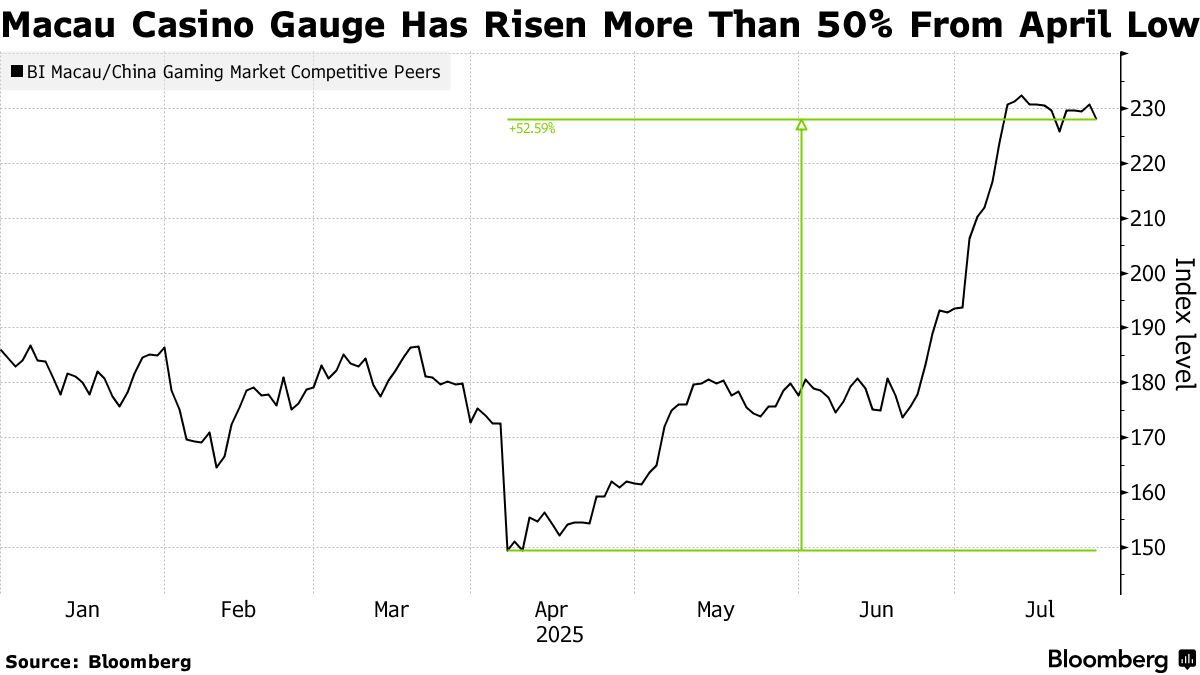 彭博行業研究數據顯示,澳門博彩股指數自4月低點已上漲53%,同期恒生綜合指數漲幅為30%。這一漲勢源於全球最大博彩中心過去三個月每月博彩收入均超分析師預期。