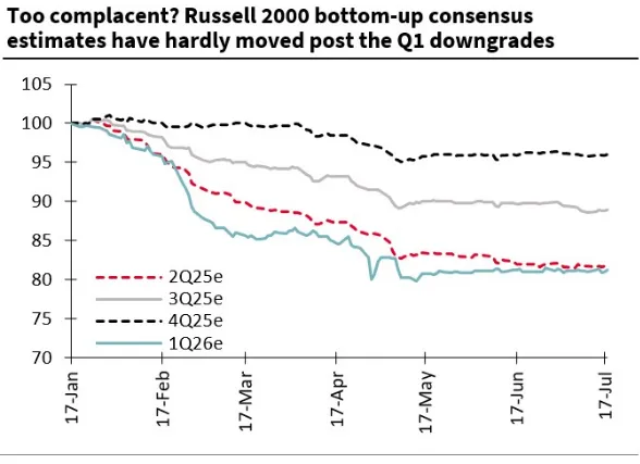 如果存在反常樂觀情緒的空間,拉普索恩認為可能在於經紀商對小盤股的盈利預期,這些預期在第一季度大幅下降,但此後幾乎沒有變化。有可能這些小公司被低估了: