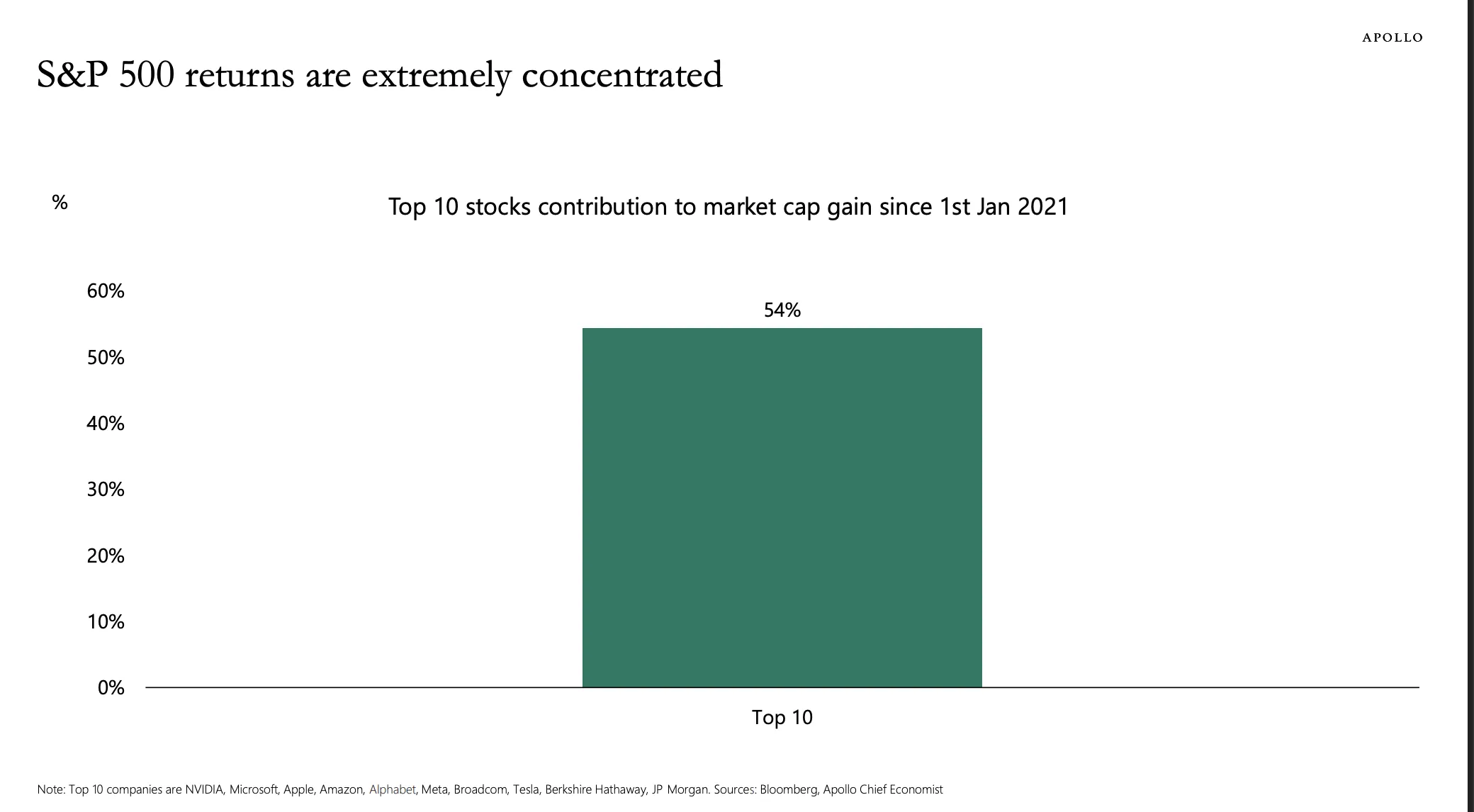 此前行情夭折的催化劑包括:大盤股估值過高、小盤股深度折價、寬鬆利率預期,以及特朗普候選人關税政策將緩解小盤股競爭壓力的預期。如今這些要素再度齊備。然而一年過去,顛覆巨頭股AI驅動的主導地位仍是遙不可及的夢想。正如阿波羅公司的託斯滕·斯洛克所示,市場集中度已達極端水平: