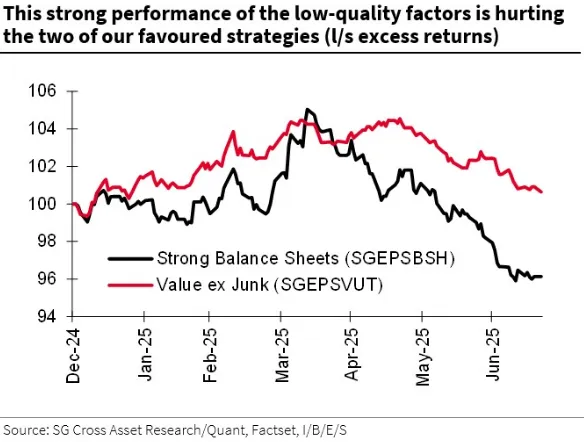 人們很容易認為這些激勵措施不足以提振小盤股板塊。但其中也有細微差別。法國興業銀行的安德魯·拉普索恩指出,兩種避開最低質量小盤股的策略在第一季度表現優異,但隨後回落。他的“強對弱”資產負債表策略支持財務穩健的公司,並做空羅素2000指數,而“剔除垃圾股的價值”策略則收緊篩選條件,避開弱勢和虧損股票,以瞄準最有價值的小盤股: