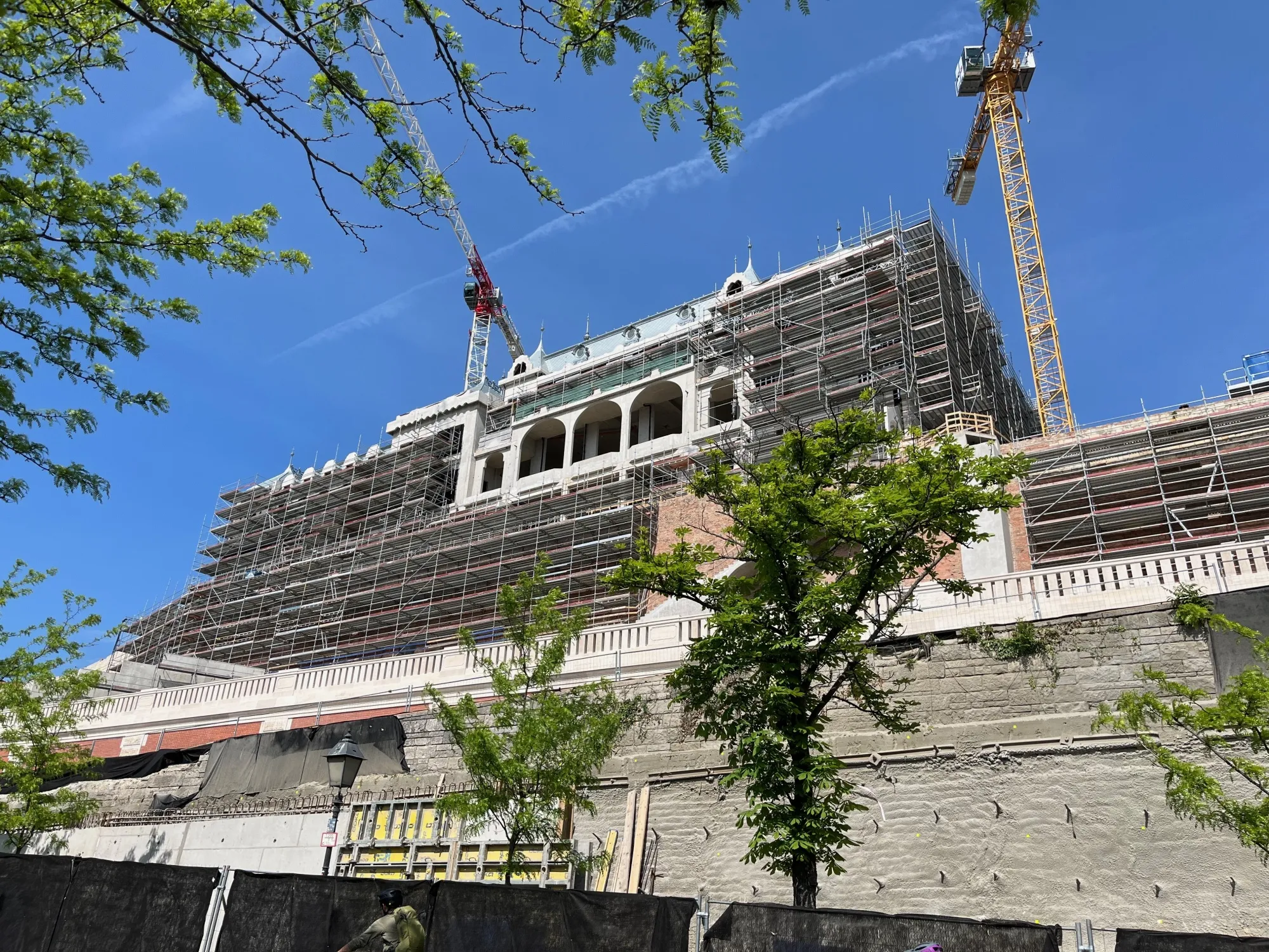 這些建築本質上是覆蓋着歷史主義裝飾表層的混凝土空殼,其外觀常與復刻原型存在明顯差異。例如重建的皇家防禦指揮部,如今穹頂坐落於比原版更高更粗的基座上,而建築體量卻縮減了一半——或許是為了減少對後方原修道院內歐爾班辦公室觀景視線的遮擋。其他區域則用新建磚砌坡道覆蓋了現存的中世紀城牆遺蹟。