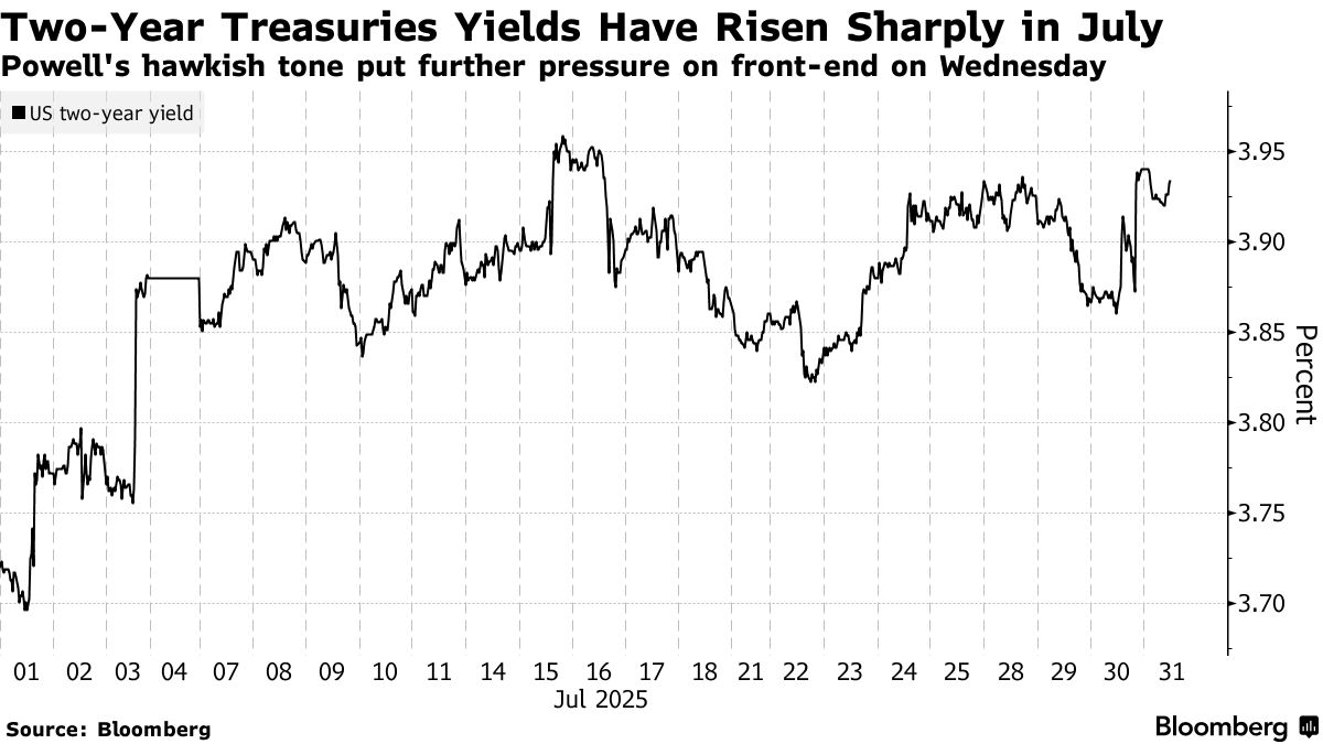 美國兩年期國債收益率——對貨幣政策變化最為敏感——7月以來已攀升超過20個基點。週四變動不大。