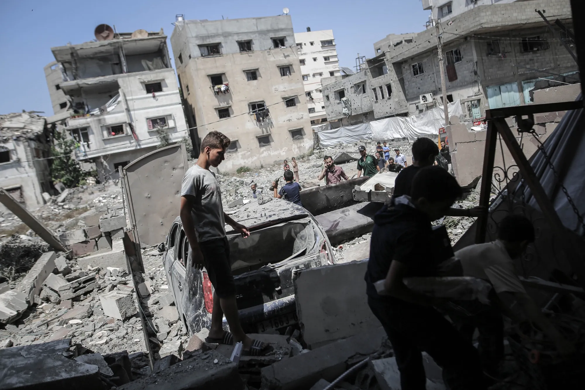 六月份,加沙城一處居民樓遭以色列空襲後,巴勒斯坦人正在檢查損毀情況。