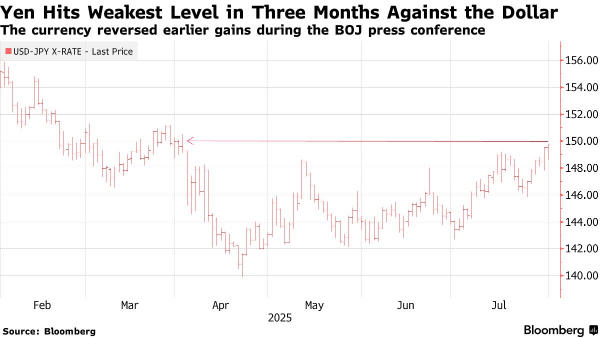 日本央行這一決定出台前,美國總統特朗普上週宣佈對日本商品加徵15%關税,遠高於今年初出口商面臨的税率水平。央行表態降低了市場對加息的強烈預期,導致日元走軟。