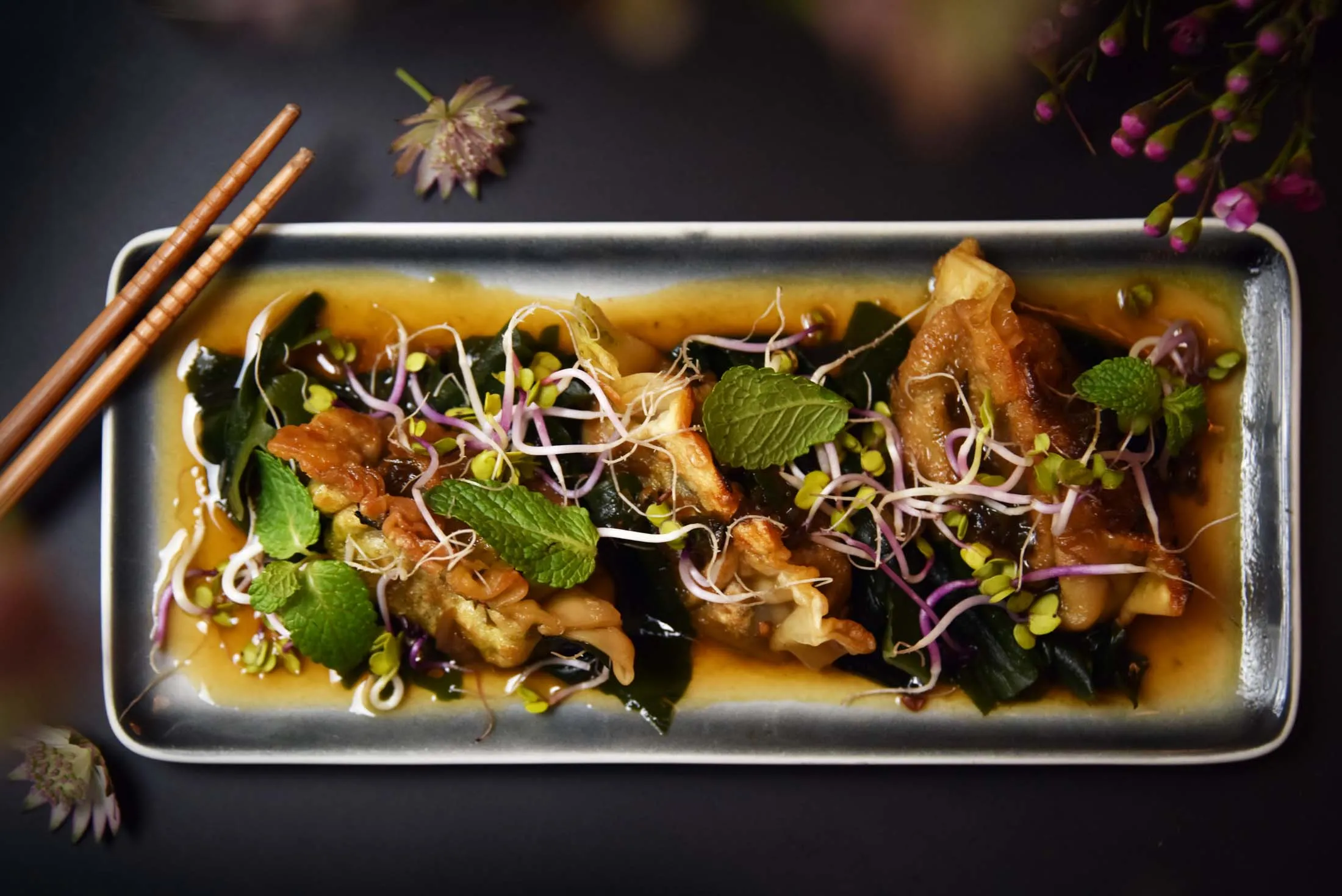 巴黎時尚餐廳Persil裏,一份融合海藻與綠茶元素的植物基日式煎餃。
