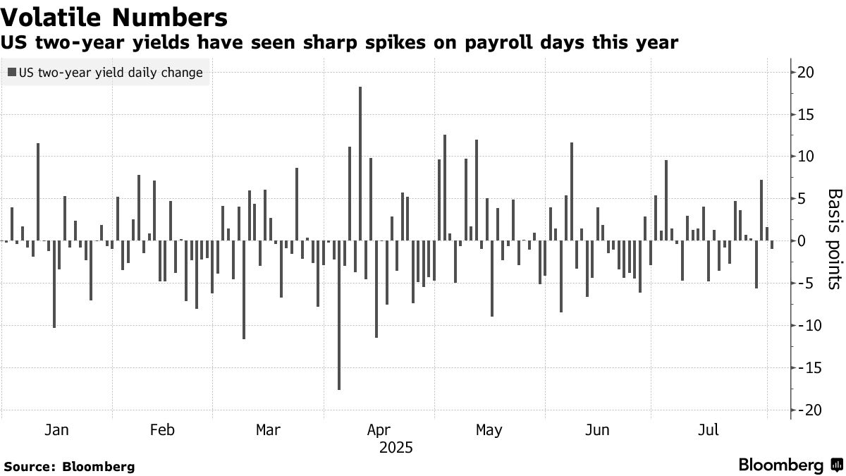 對美聯儲政策最敏感的兩年期國債收益率,在過去一年非農數據發佈日平均波動10個基點,是消費者價格指數發佈日波幅的兩倍。