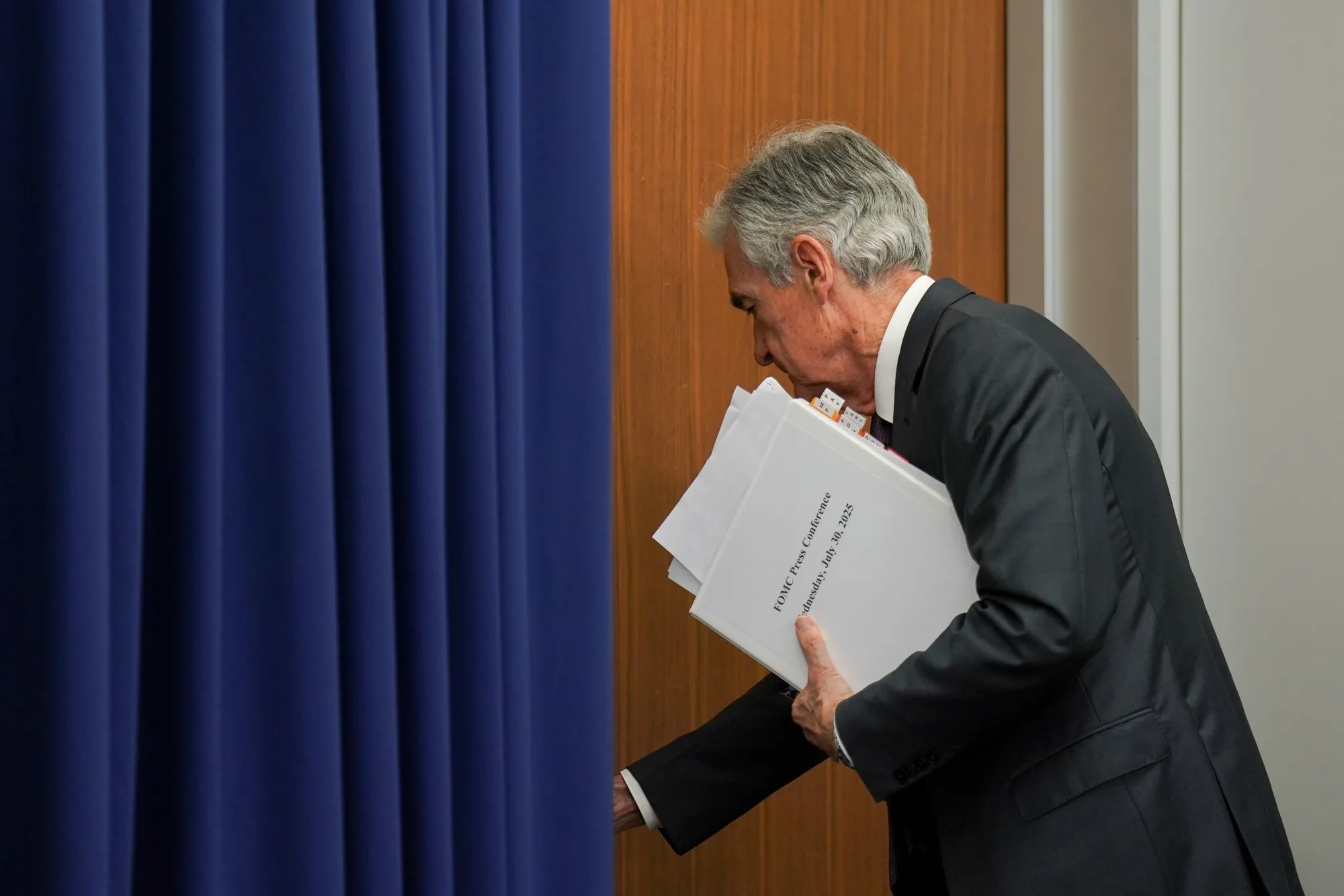 美聯儲主席傑羅姆·鮑威爾在華盛頓特區聯邦公開市場委員會(FOMC)會議後的新聞發佈會上離場,暗示可能即將降低借貸成本。