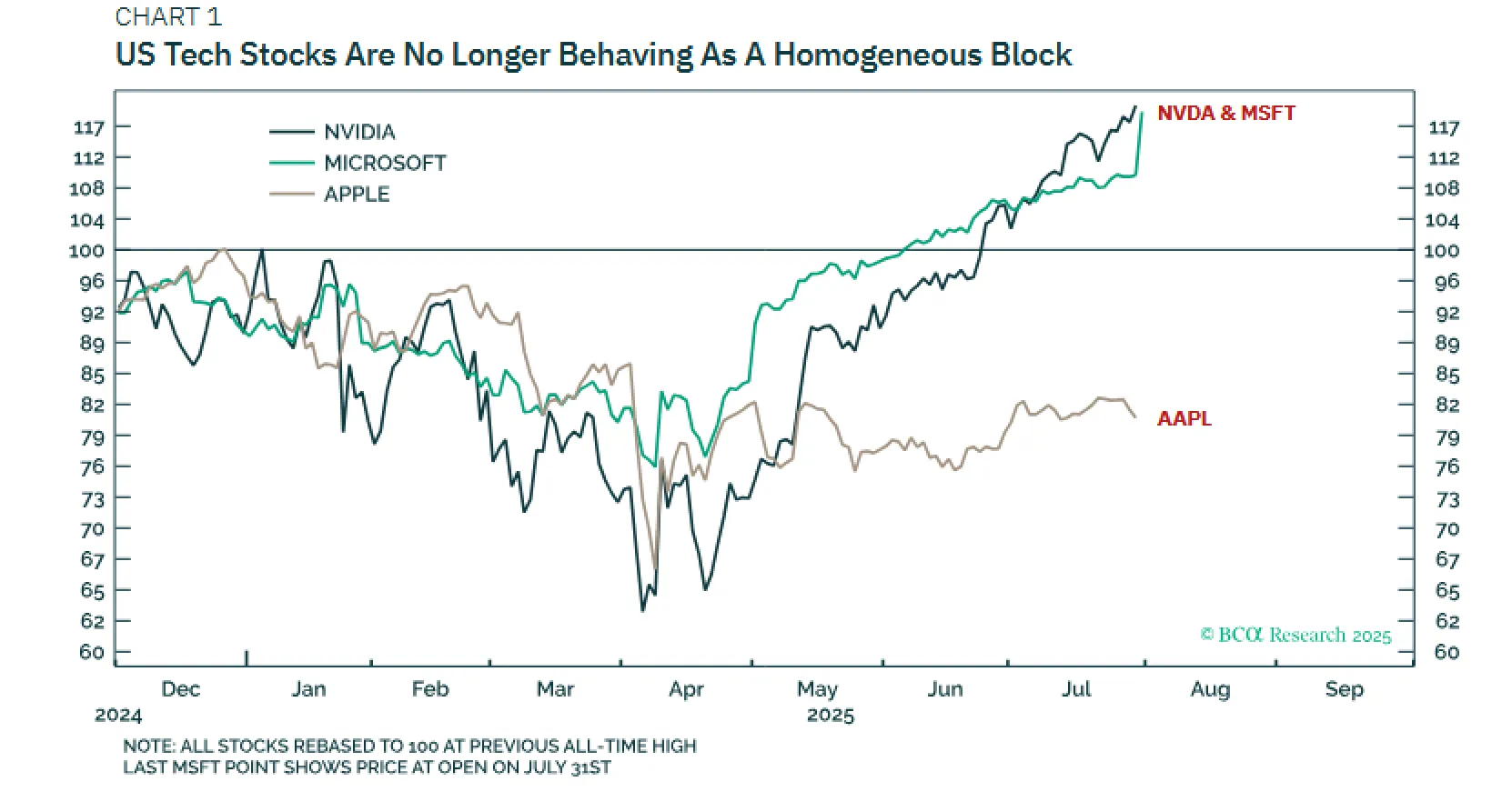 另一個關鍵點是,即使在科技巨頭之間,業務廣度也在收縮。微軟公司和英偉達公司將於本月晚些時候公佈的財報將成為焦點。BCA Research的達瓦爾·喬希指出,這種兩極分化現象伴隨着它們股價近20%的飆升並創下歷史新高。作為對比,蘋果公司市值已蒸發7000億美元,較峯值下跌近20%。如此大幅度的下跌應當引起警惕。
