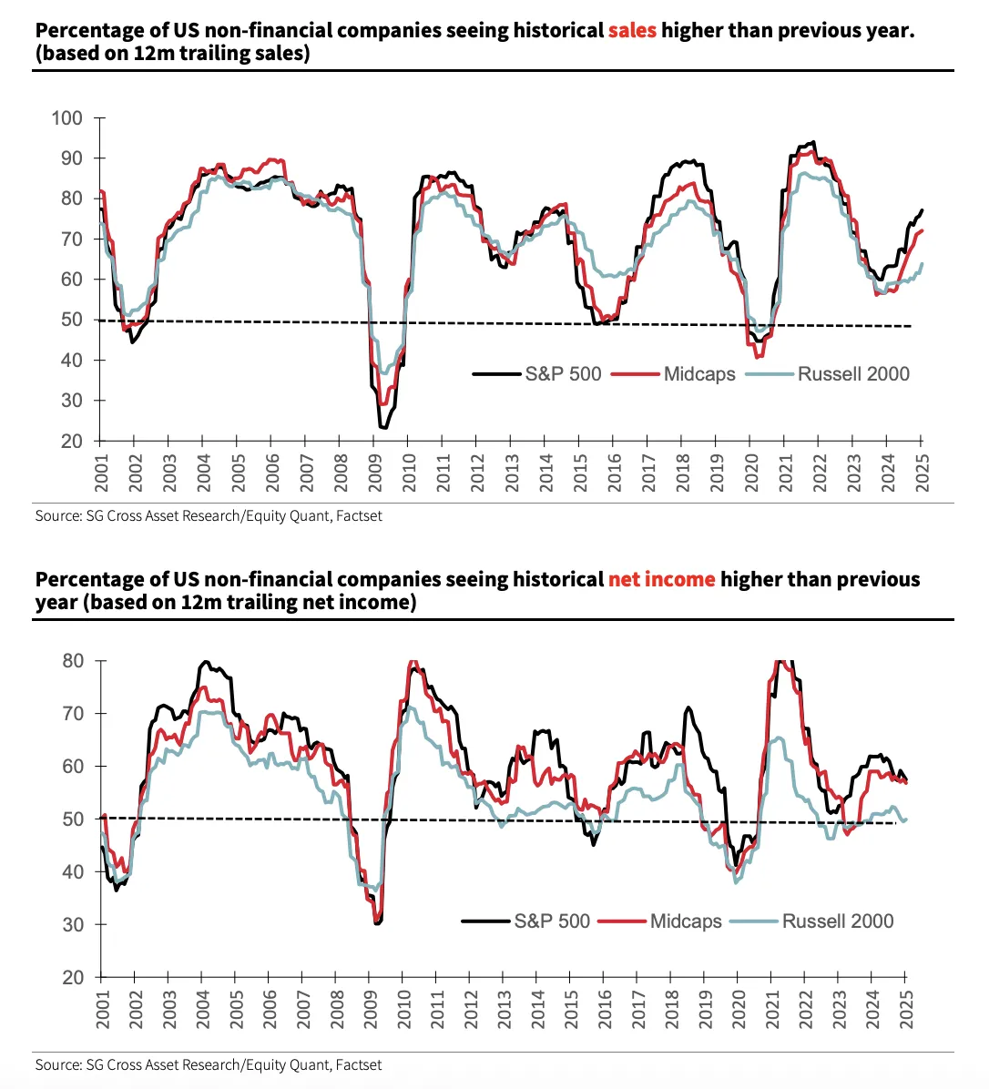 總體而言,關税不確定性正在削弱人工智能驅動亮眼業績的光彩,市場廣度正在縮小。法國興業銀行的安德魯·拉普索恩指出,標普500指數前十大成分股佔該指數市值的40%,佔總利潤的三分之一。截至目前,超過半數已發佈財報的公司利潤率出現下降,儘管更多公司報告銷售額增長。拉普索恩表示,法興銀行以下圖表顯示的銷售額增長與利潤提升之間的分化並不尋常。一個合理的解釋是企業在承擔關税壓力而非轉嫁給客户: