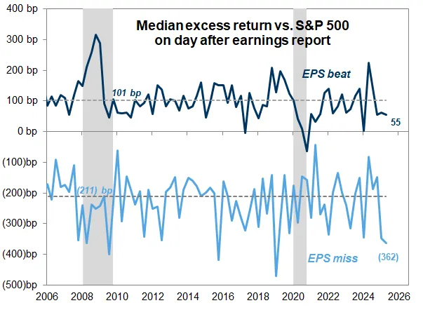 公佈正面盈利驚喜的股票中位數在報告發布次日僅跑贏標普500指數55個基點,低於101個基點的歷史中位數"獎勵"。高盛的大衞·科斯廷認為,這源於分析師在本財報季前設定的預期門檻低得不切實際——這也解釋了為何未達每股收益預期的公司表現落後幅度接近歷史典型平均水平的兩倍: