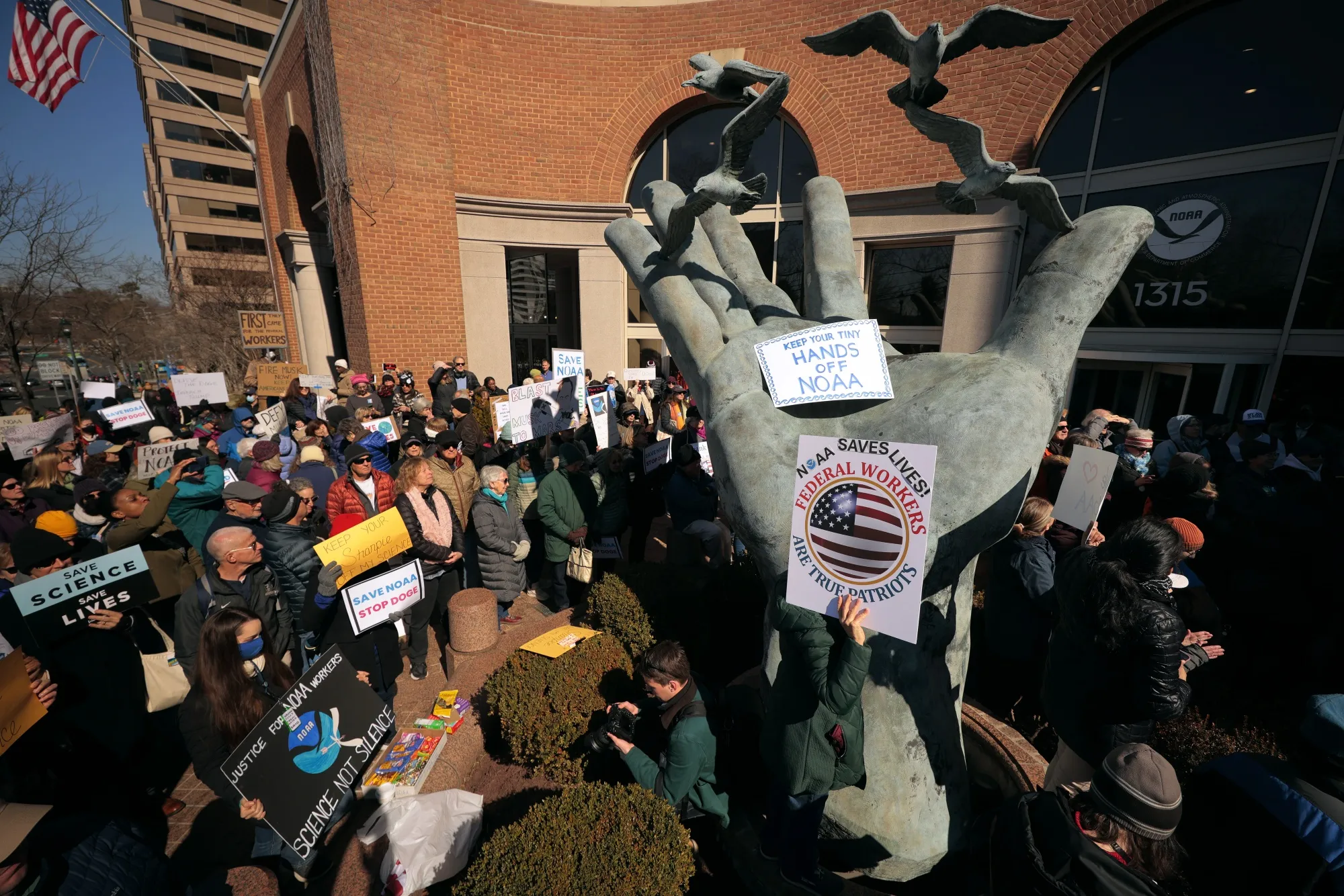 示威者在馬里蘭州銀泉市美國國家海洋和大氣管理局總部外抗議可能出現的預算削減。攝影師:Chip Somodevilla/Getty Images特朗普對NOAA的預算削減提案與其首個任期內對該機構的支持形成鮮明對比。儘管質疑者長期抨擊NOAA的氣候變化研究,但該機構關於長期局部天氣(即氣候)的工作此前基本未受影響。