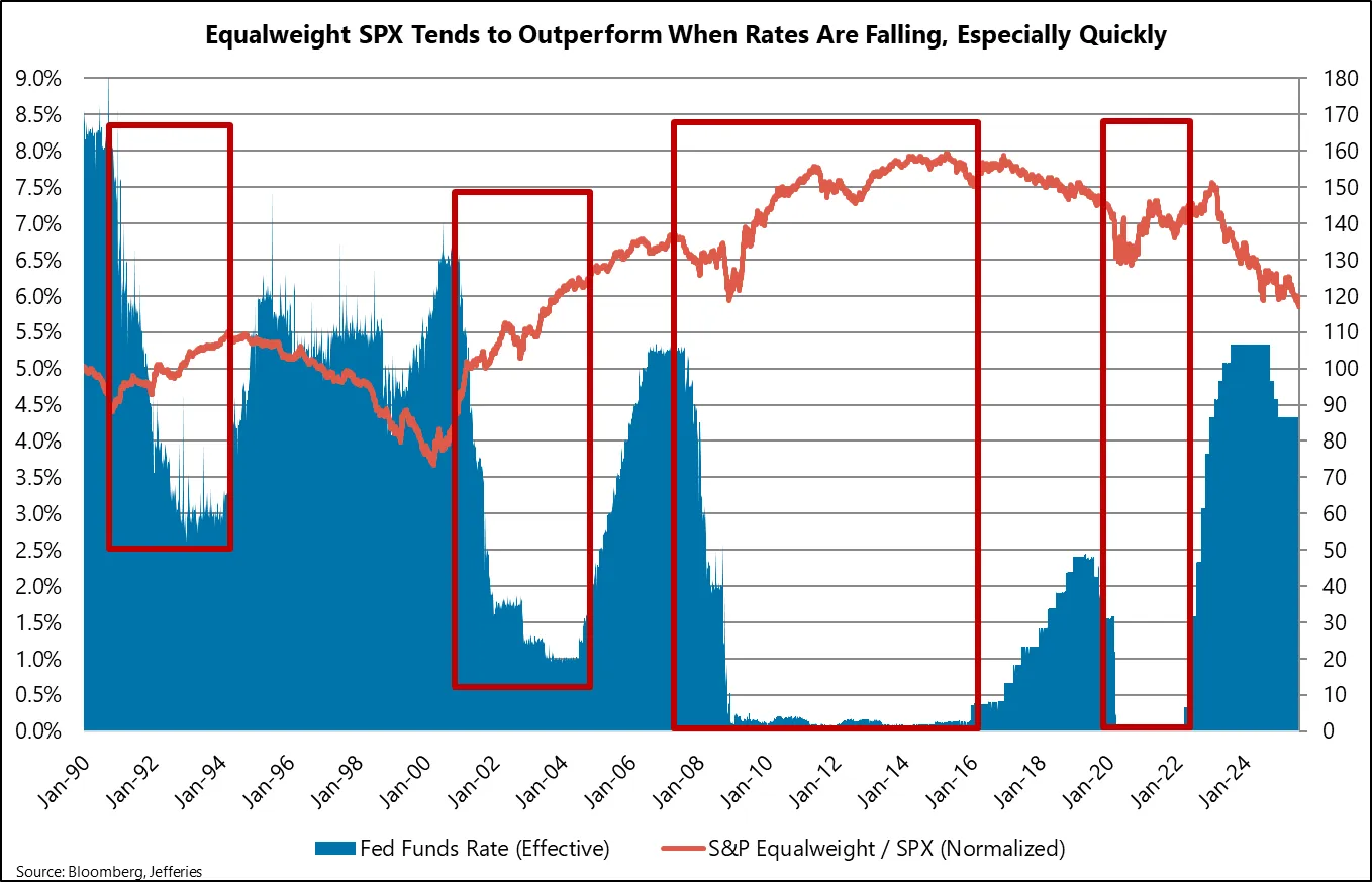 傑富瑞股票研究產品管理高級副總裁安德魯·格林鮑姆表示,回溯至1990年的數據顯示,當美聯儲降息時,標普500等權重指數的表現優於傳統的市值加權基準指數。