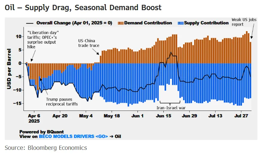 - 支撐油價的是需求,自4月以來,需求為油價貢獻了8美元。但這種支撐並不穩固。7月份美國疲軟的就業報告顯示,自特朗普發動關税戰以來,這個全球最大經濟體幾乎沒有創造就業機會。