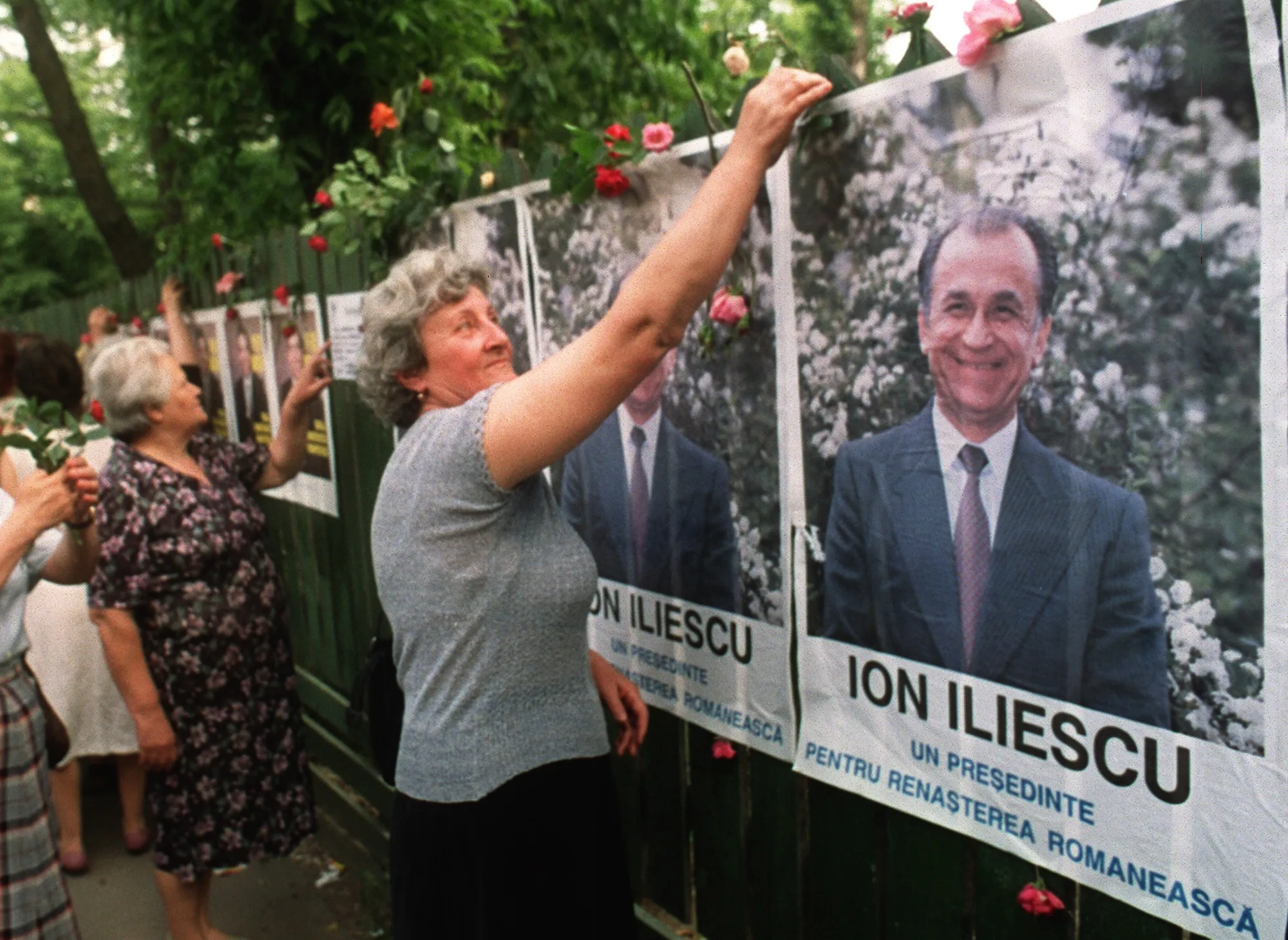 1990年5月總統和立法選舉前,布加勒斯特的救國陣線支持者在伊利埃斯庫最後一次競選活動中,將鮮花放在他們領導人的海報上。攝影師:傑拉德·福埃特/AFP/Getty Images儘管他在共產黨政權垮台後因迅速穩定國家局勢而受到讚譽,但其總統任期卻因多項爭議性決策和事件蒙上陰影——首當其衝的便是1990年他召集礦工鎮壓布加勒斯特反政府抗議活動,最終演變成導致數千人受傷的暴力衝突。