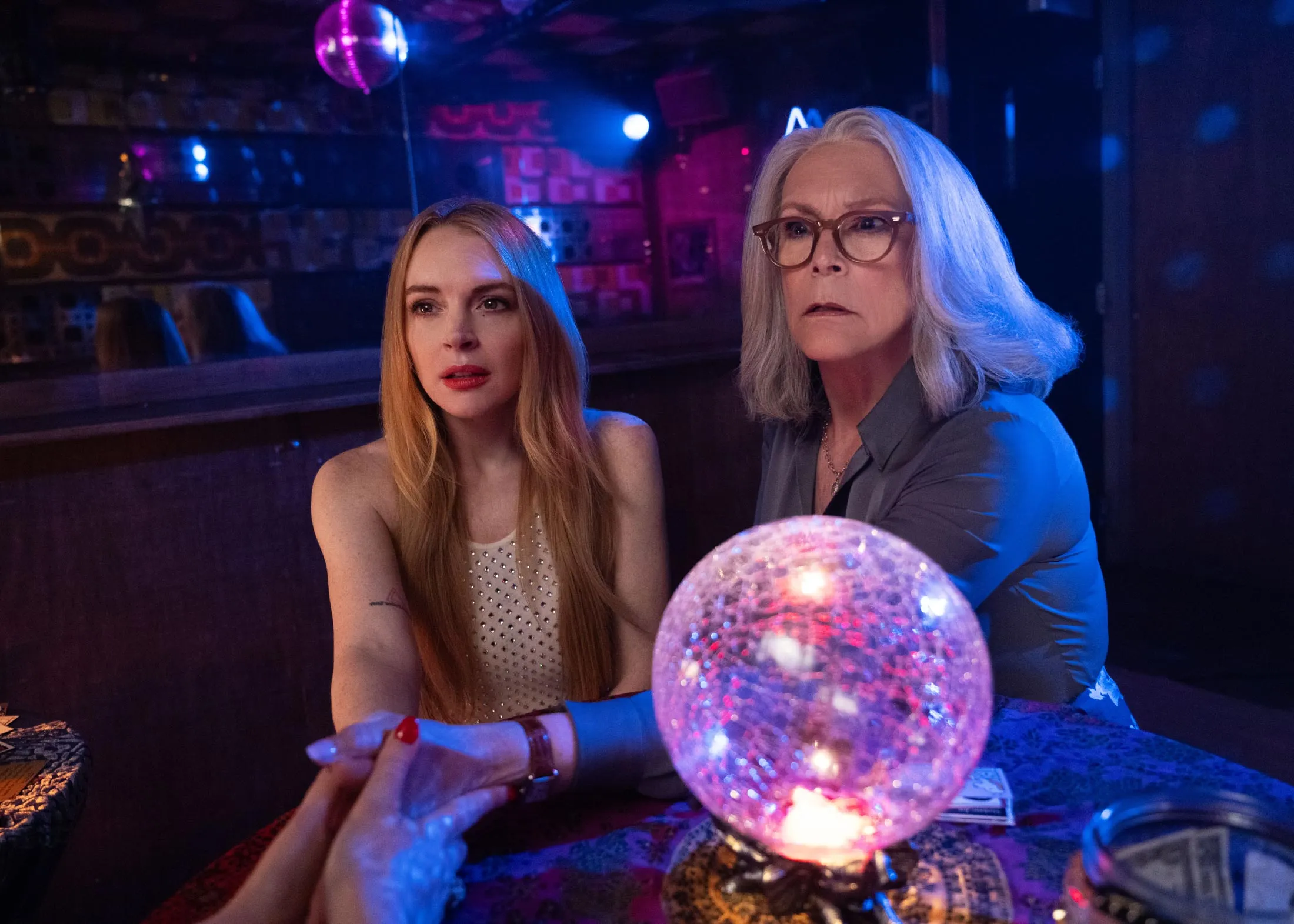 於是當身體互換髮生時(這要歸功於安娜單身派對上聘請的通靈師/靈氣治療師/萬能企業家,瓦妮莎·拜爾以荒誕絕倫的演技完美演繹),所有人都有大量問題需要解決。安娜進入了哈珀的身體,反之亦然;苔絲則與莉莉互換。後者讓柯蒂斯有機會淋漓盡致地展現英式俚語。事實上,以本尊演繹年輕角色或許是對柯蒂斯銀幕張力的絕佳運用。