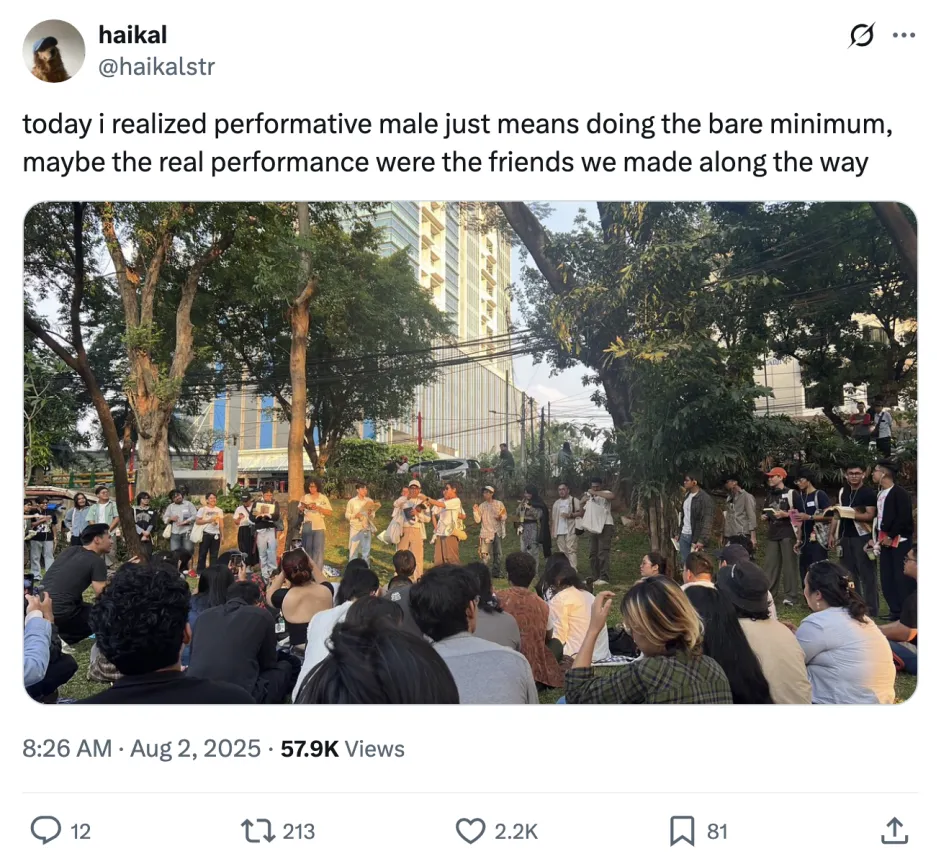 如果你最近幾周在社交媒體上花過時間,你可能已經看到了“表演型男性”的原型:一個年輕、類似雅各布·艾洛迪的身影在貝德-斯圖伊的街道上游蕩,用悲傷女孩音樂從有線耳機中大聲播放,並攜帶一個帆布手提袋。一隻手拿着一杯冰燕麥奶抹茶拿鐵,另一隻手拿着一本翻舊的女性主義文學,腰帶上還掛着一個拉布布。