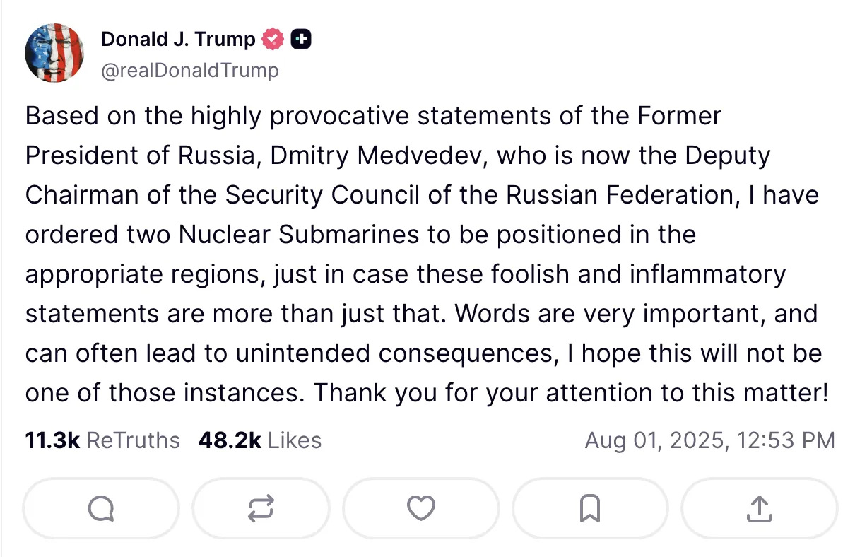 詹姆斯表示,無論重新部署的是哪種潛艇,特朗普都選錯了目標:“我見過梅德韋傑夫,儘管他有政治資歷,但在普京的權力體系中並非核心人物。“他指的是現任俄羅斯安全會議副主席、前總統德米特里·梅德韋傑夫。“特朗普應該無視他反覆無常的言論,集中精力對俄羅斯經濟直接施壓。”
