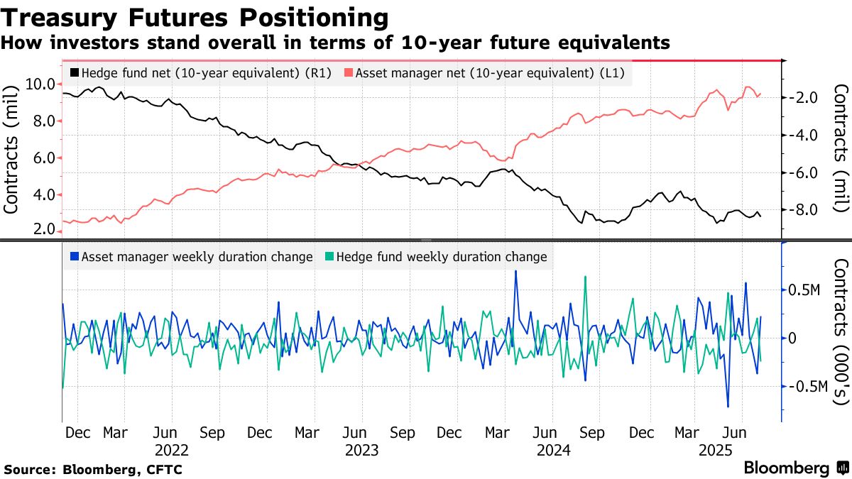 截至7月29日當週(美聯儲決議前一日),對沖基金大舉建立10年期國債期貨淨空頭頭寸。資產管理公司則反向操作,增加該期限淨多頭持倉,並增持長期國債和超長期國債期貨多頭。
