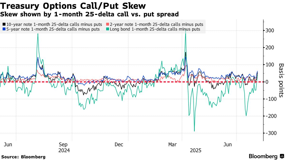 上週五非農就業報告發布後,整條收益率曲線上的國債期權偏斜轉向看漲期權傾斜,因交易員為對沖債券市場持續上漲而非拋售支付溢價。長期債券期權偏斜已升至4月以來最看漲水平。