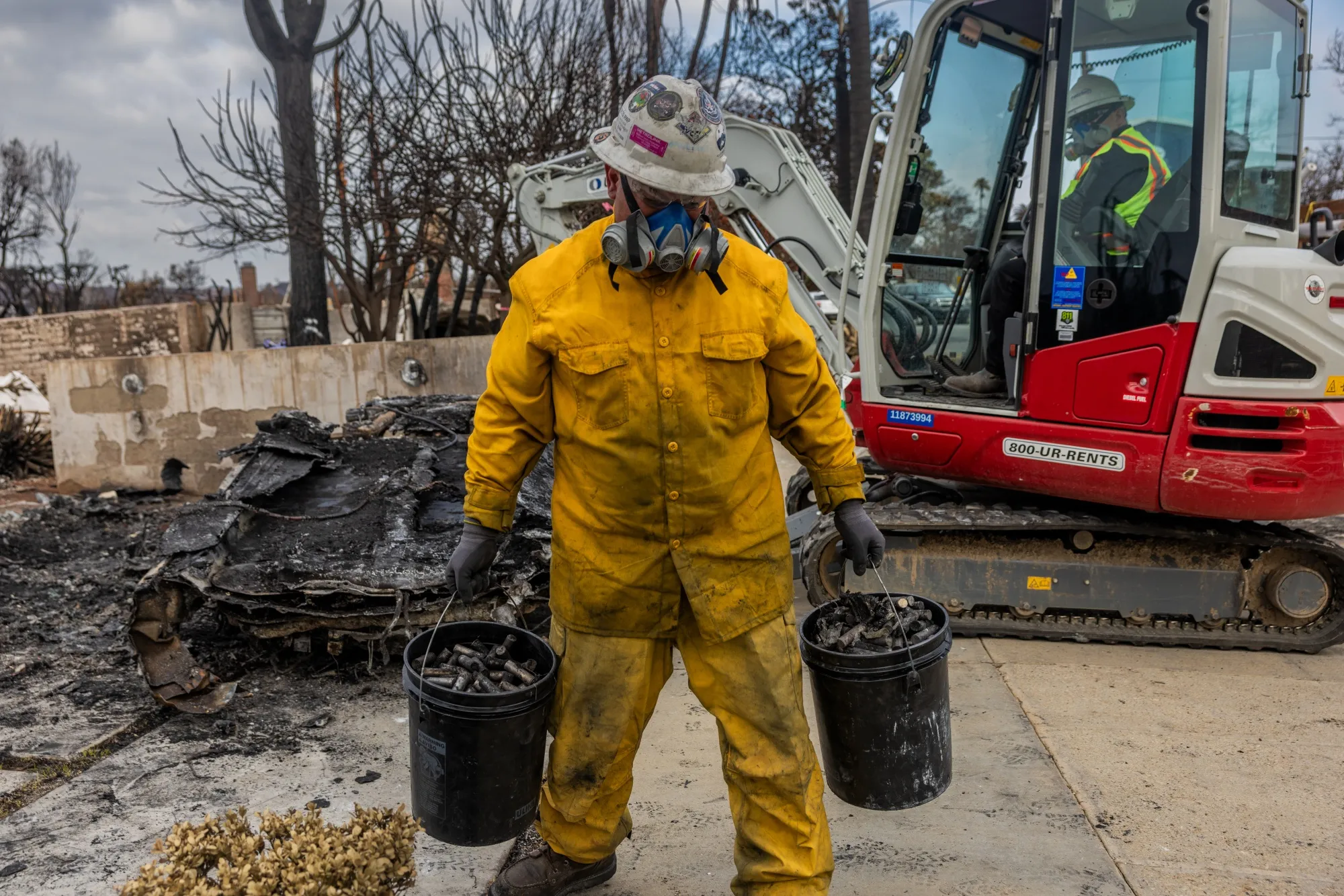 美國環境保護署工作人員正在清理洛杉磯帕利塞茲大火後的現場。