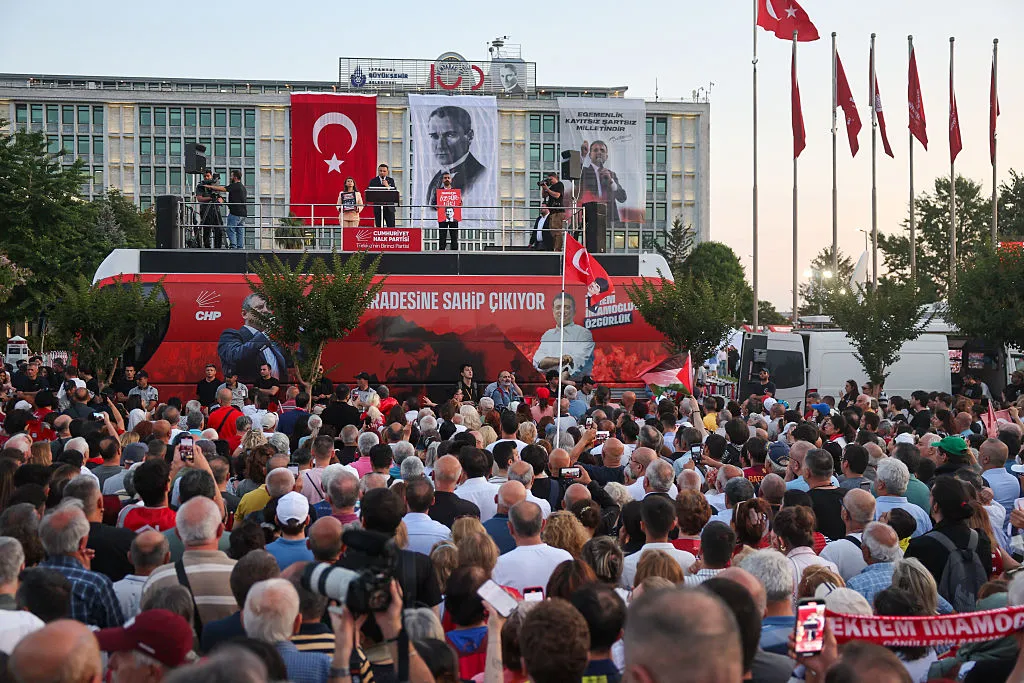 7月1日,由共和人民黨組織的集會,紀念埃克雷姆·伊馬姆奧盧市長被捕100天。攝影師:伯克曼·烏魯廷/dia images via Getty Images伊斯坦布爾目前由伊馬姆奧盧同黨的代理市長努裏·阿斯蘭管理,他在7月24日的新聞發佈會上表示,市政府“日夜奮戰,確保服務不中斷或停止”。