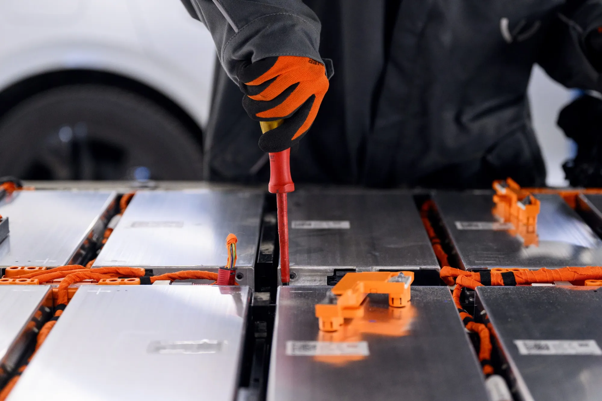 一名技術人員在挪威赫瓦姆的電池組車間工作。