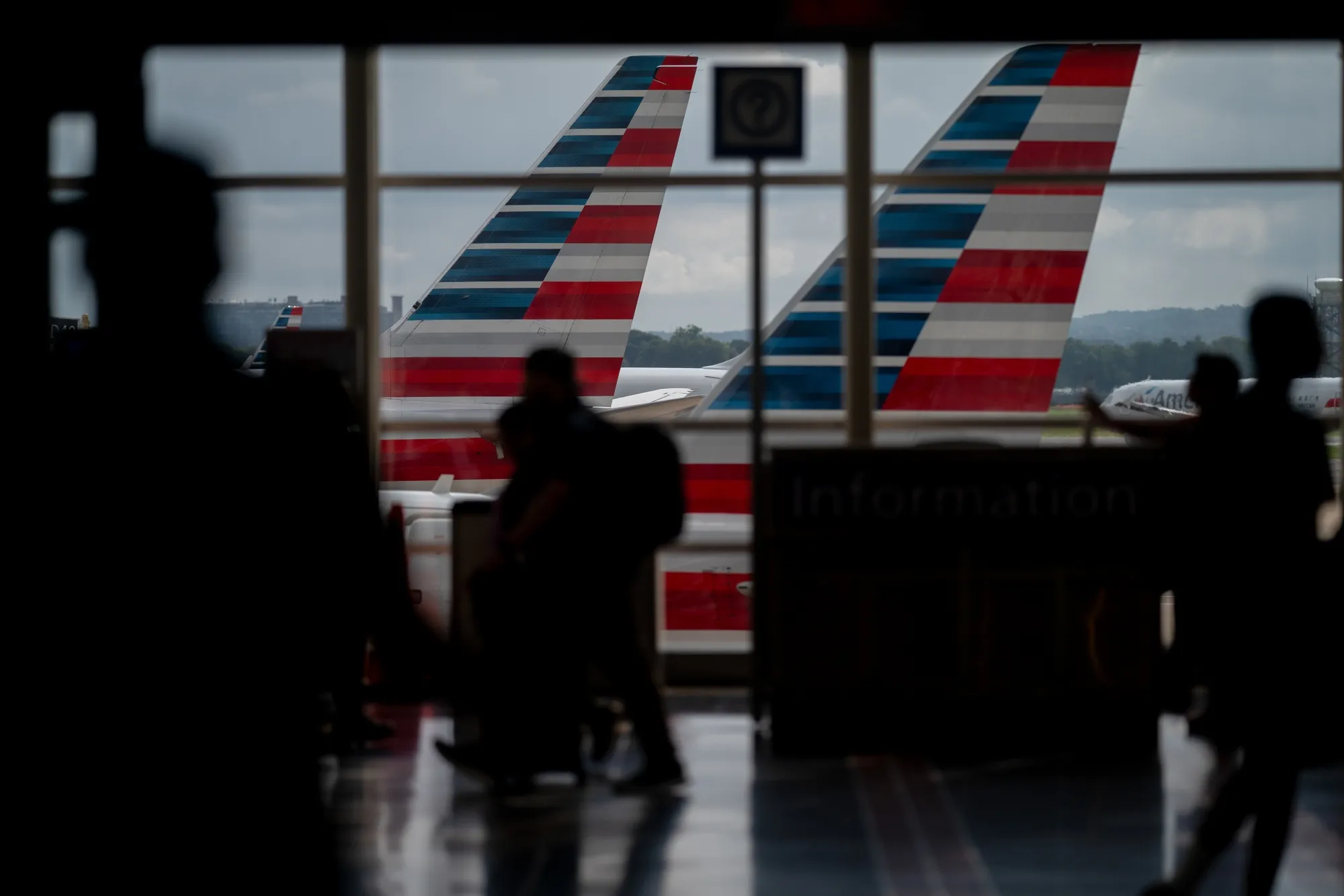 2025年7月19日星期六,美國弗吉尼亞州阿靈頓的羅納德·里根華盛頓國家機場(DCA),旅客們走過美國航空公司的飛機。