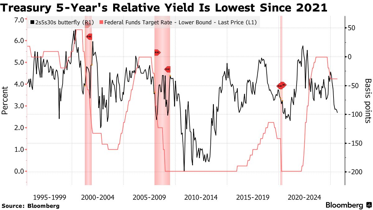在稱為"蝶式價差"的計算中,將五年期收益率翻倍後減去兩年期與三十期收益率之和。當前接近-100個基點的結果,是2021年初以來波動區間的下限水平。