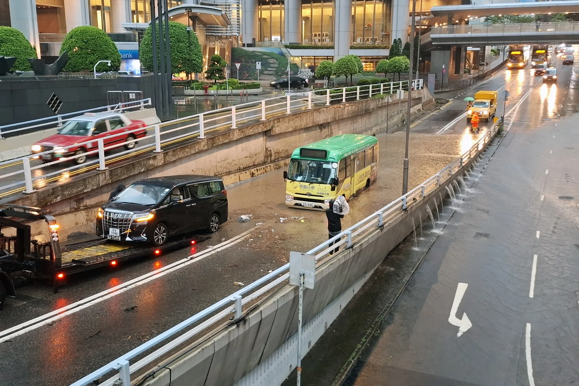 中環一輛被困的小巴。攝影師:Emily Yamamoto/彭博社週二在香港舉行的極端降雨研究會議(因暴雨改為線上舉行,恰如其分)上,與會者打趣着天氣。一位研究者臨時調整演講內容,直接分析這場暴雨,解釋兩種不同氣流如何導致華南強降雨——正是本週經歷的這類暴雨。其他人則提出城市如何提前防範極端降雨。香港渠務署一位土木工程師展示了一個新的洪水風險模型,可精確模擬街道級別的潛在淹水情況。