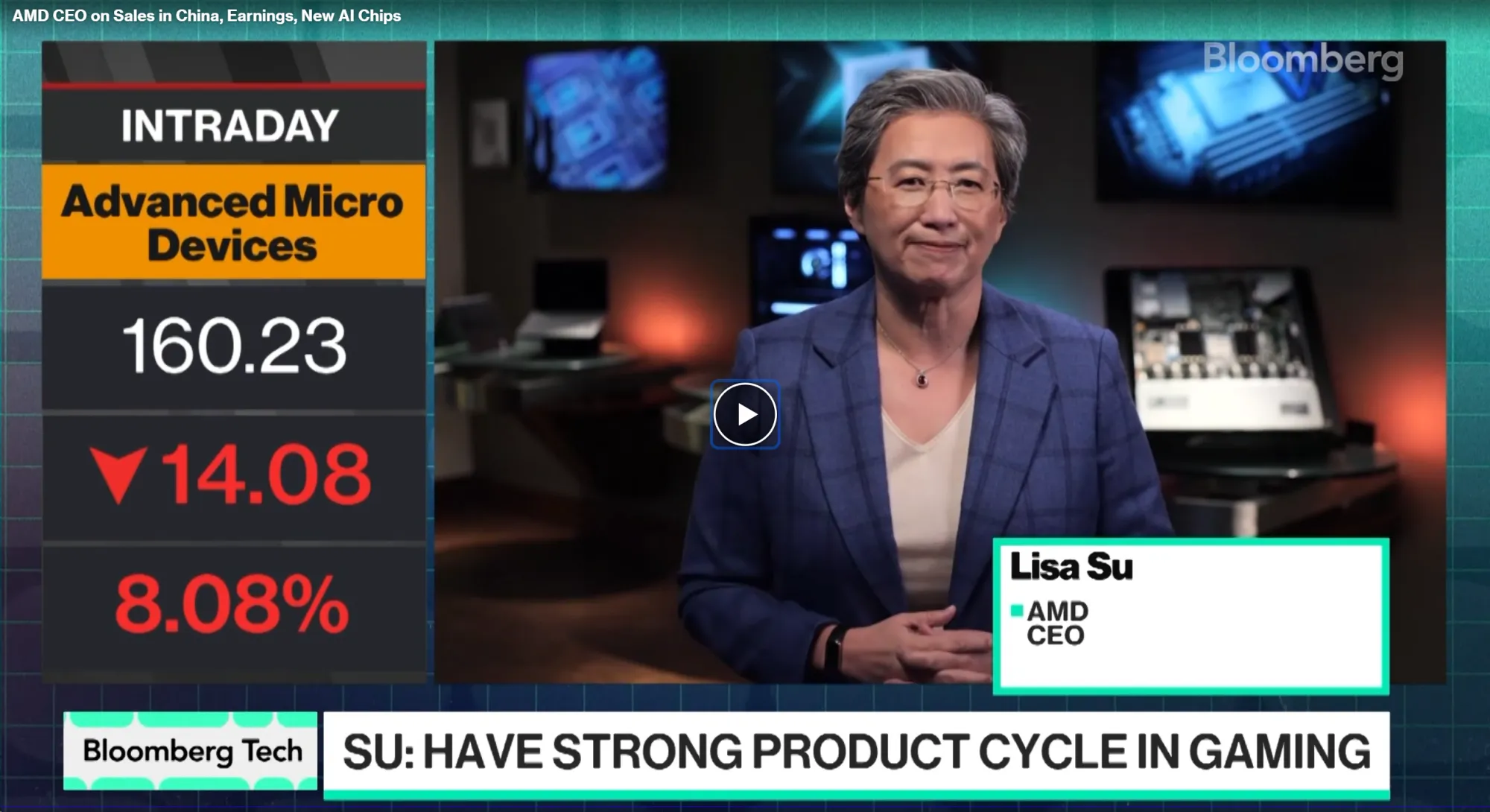 AMD首席執行官蘇姿豐做客彭博科技頻道,探討芯片製造商業績及特朗普政府允許向中國銷售部分人工智能處理器的決定。