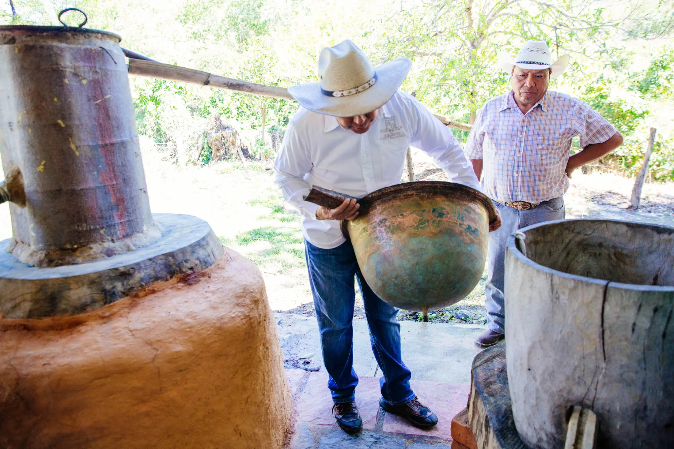 萊西拉生產中使用的"菲律賓式"蒸餾器銅製冷凝器。攝影師:莉茲·迪瓦恩"墨西哥在西班牙殖民時期與菲律賓往來密切,“梅里諾談及這些可能由空心樹幹或陶罐製成、配銅製冷凝器的蒸餾器操作者時表示,“墨西哥烈酒的迷人之處在於多元文化的交融。“注:此為小批量生產烈酒,不同批次風味可能存在細微差異。