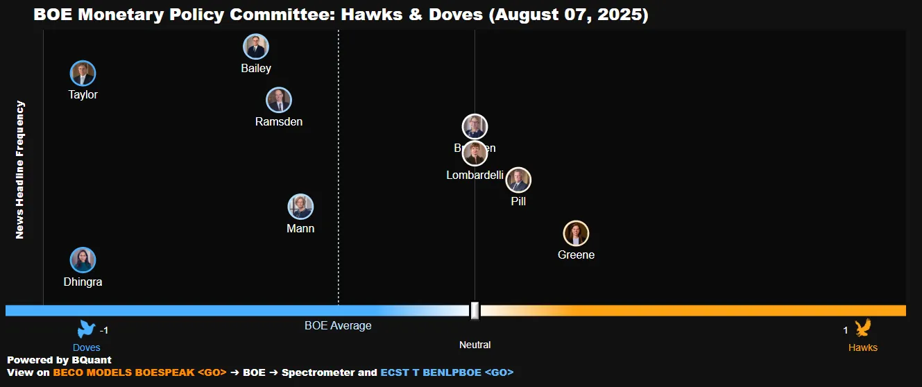 來源:彭博經濟研究彭博經濟研究的BOEspeak指數還顯示,貝利與隆巴第利之間出現了分歧。根據彭博新聞的標題分析,貝利最近的言論比英國央行平均水平更為鴿派,尤其比持中性立場的皮爾和隆巴第利更為明顯。