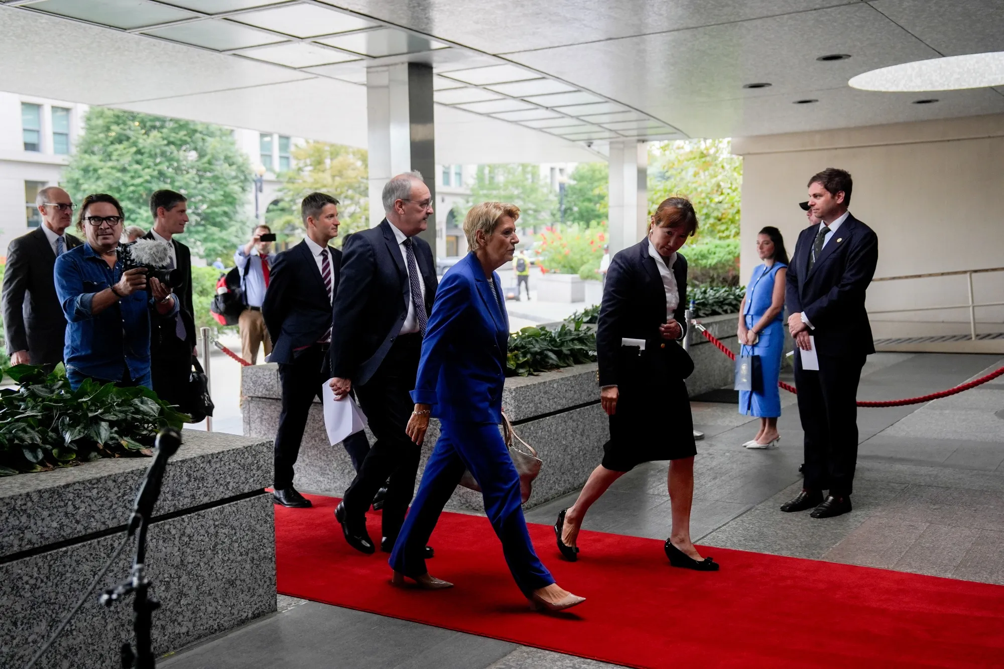 瑞士總統卡琳·凱勒-祖特爾(中)與經濟部長居伊·帕梅林(左中)於8月6日抵達美國國務院。攝影師:Kent Nishimura/彭博社7月4日美國慶祝獨立日當天,瑞士聯邦委員會同樣有理由歡慶——他們原以為已通過協議成功規避了特朗普的懲罰性關税。