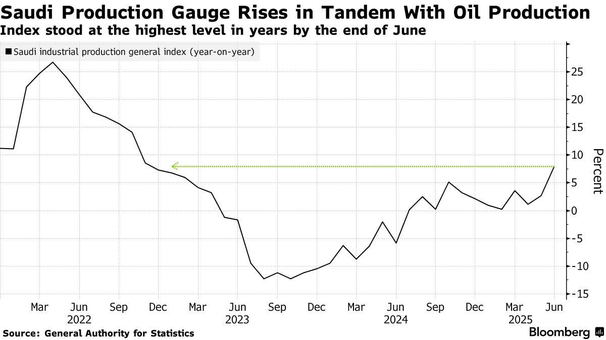 初步數據顯示,在非石油部門穩定增長及石油活動恢復擴張的推動下,沙特國內生產總值在截至6月的三個月內同比增長近4%,該國正根據新OPEC+供應政策提高產量。