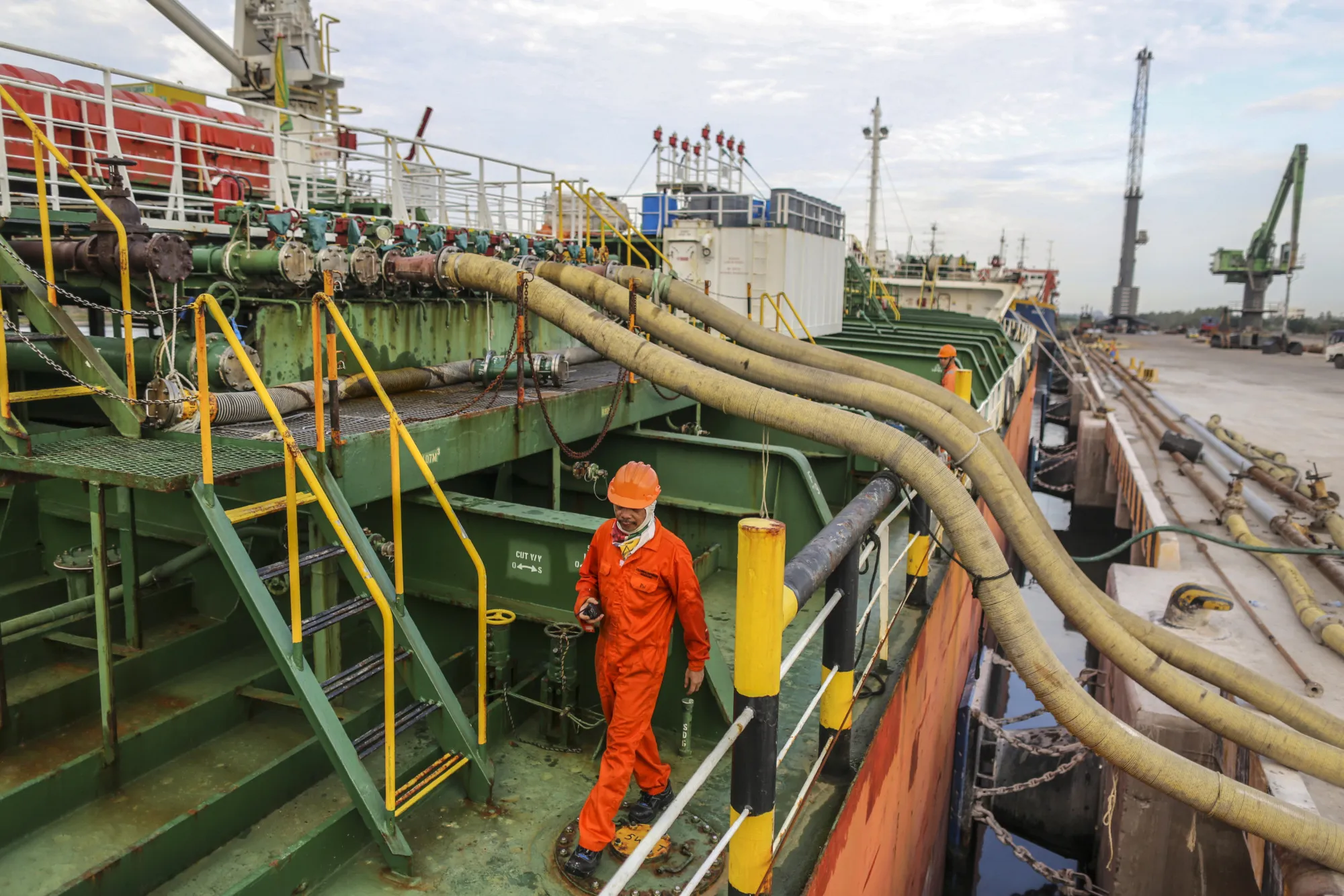 印度克里什納帕特南港,工人們正在監督油輪上的石油運輸。