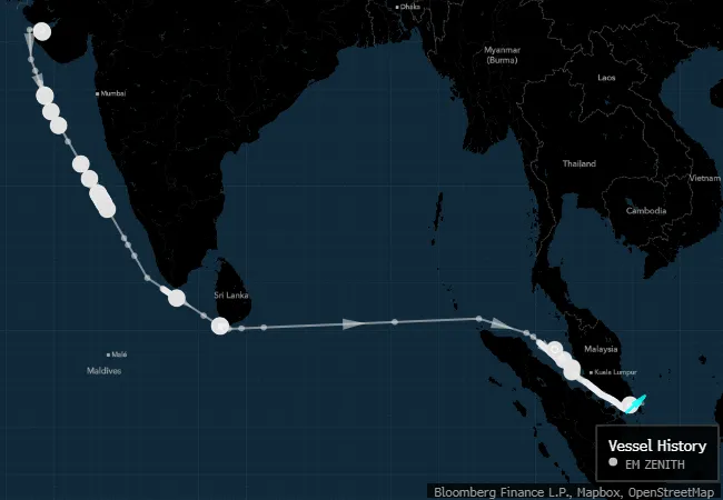 根據Kpler、港口代理報告和彭博彙編的船舶跟蹤數據,EM Zenith號於7月18日從納亞拉的瓦迪納爾碼頭啓航,裝載約49.6萬桶超低硫柴油。啓航僅數小時後,歐盟宣佈對俄羅斯石油貿易發起新一輪打擊,對俄羅斯石油公司支持的煉油廠實施限制。
