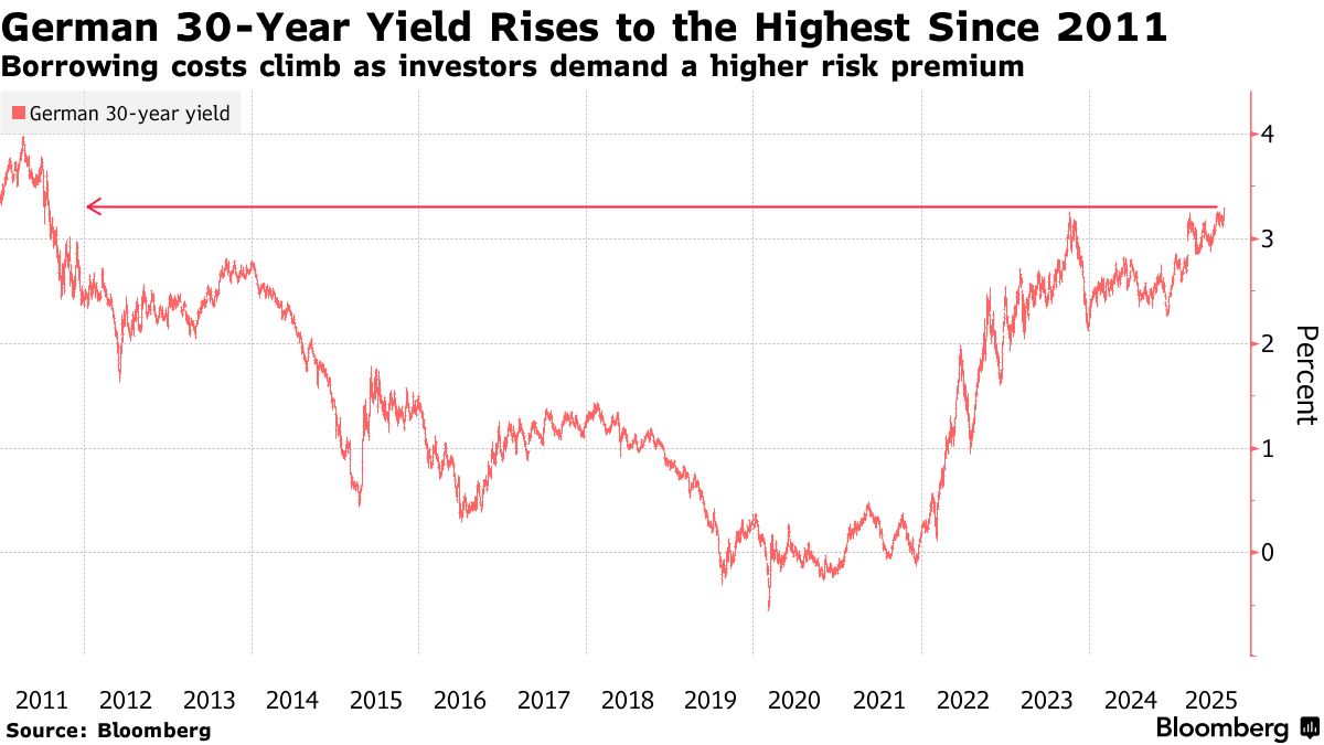 德國30年期國債收益率攀升至十四年來最高水平,這是長期債券面臨壓力加劇的最新證據。