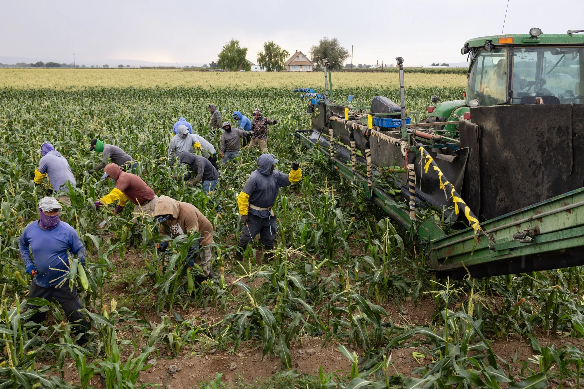 工人在華盛頓州瓦帕託的亞卡馬民族農場收割玉米。