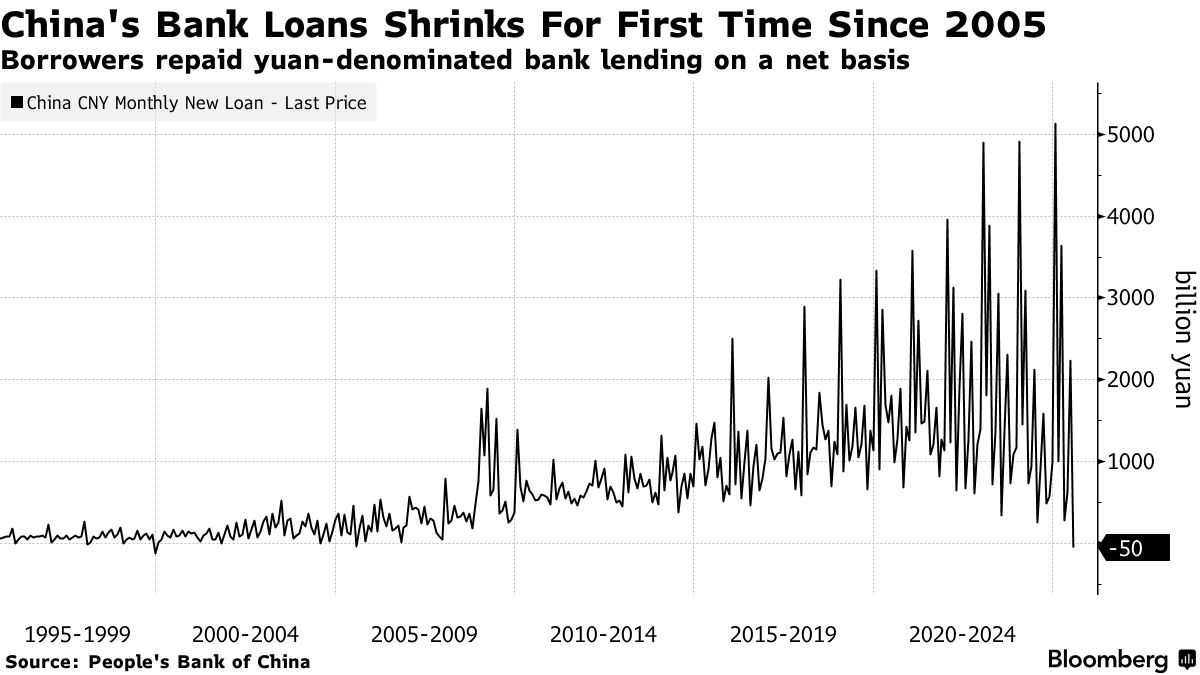7月份中國銀行信貸的關鍵指標出現20年來首次收縮,同時廣義信貸增長放緩,顯示出消費者和企業借款需求疲軟。