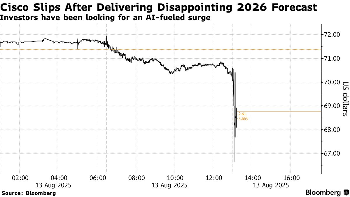 全球最大計算機網絡及互聯網設備製造商思科系統公司對當前財年給出了平淡的業績展望,令期待人工智能數據中心項目帶來增長動力的投資者感到失望。