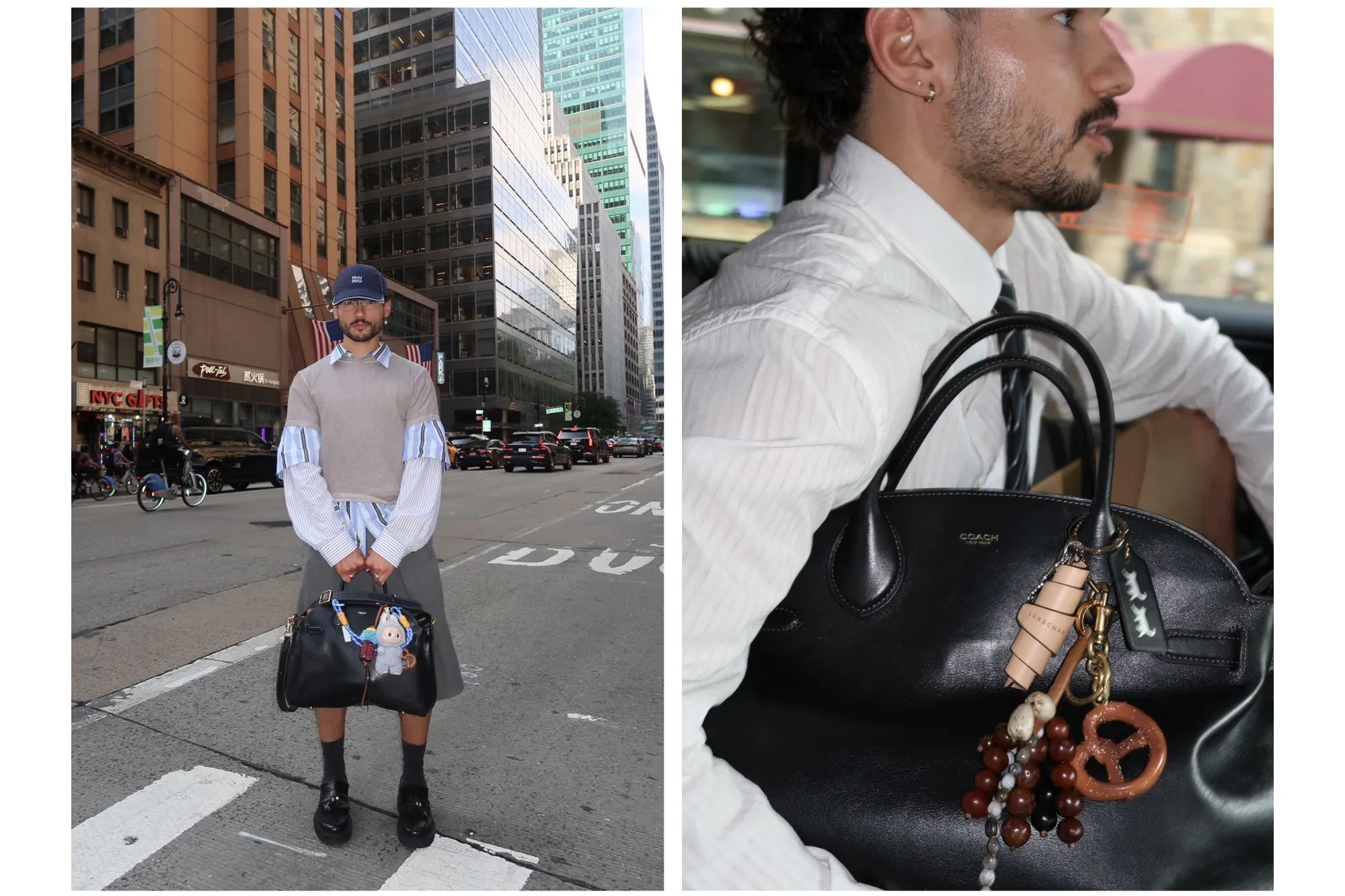 伊森·迪亞茲與裝飾着包飾的蔻馳手袋。來源:伊森·迪亞茲24歲的伊森·迪亞茲過去常揮霍購買高價手袋和幾乎不穿的潮服。如今包飾讓他在不超預算的情況下快速變換手袋造型。最近他用幾個混搭掛件裝飾了695美元的蔻馳Soft Empire手提包,包括120美元的長條形羊角麪包造型瓏驤鑰匙圈。